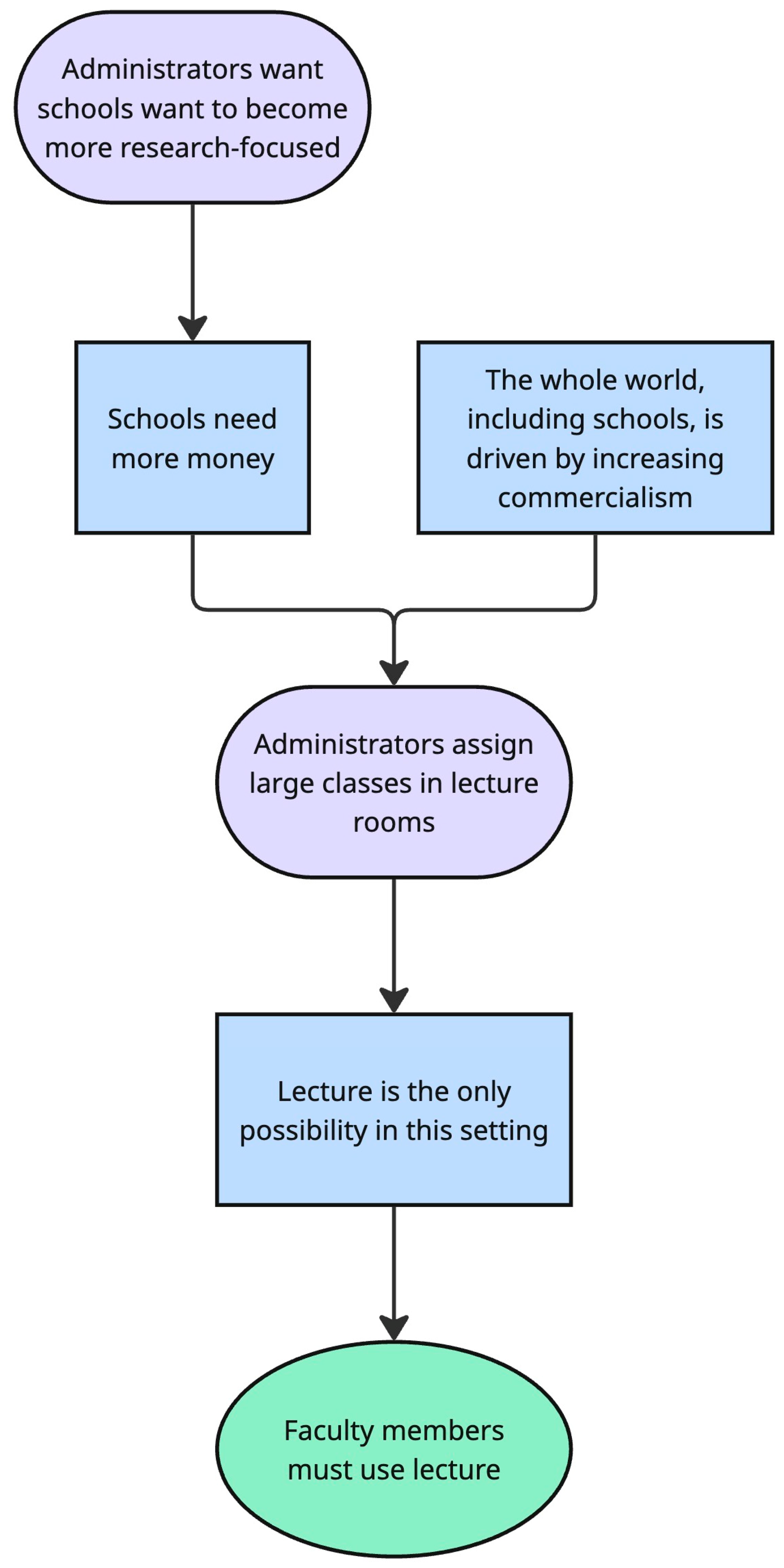 Two other faculty, Bennett and Timothy, showed signs of having a broad model of the interconnectedness of different aspects of academia that forced faculty into the situation of using lecture, potentially against their will. They both felt that financial needs drove the choices of administrators, who then made choices of classrooms and class sizes, which inevitably forced faculty members to teach via lecture. Bennett saw this financial driver as being the corporate culture of the wider society, which put pressure on families and then influenced the schools.