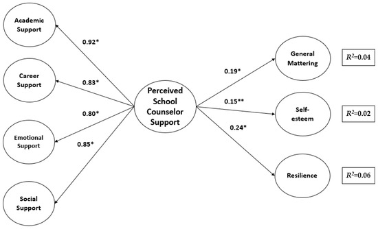 This study examined the predictor role of perceived school counselor support (PSCS) on resilience, general mattering, and self-esteem in high school students who have used counseling services. A total of 573 students (263 boys, 310 girls) participated in the study, providing insight into how counselor support may contribute to students’ psychological well-being. Structural equation modeling was employed to test the proposed second-order factor model in which PSCS was specified as a higher-order construct. Following minor, theoretically justified modifications, the final model demonstrated acceptable fit to the data (χ