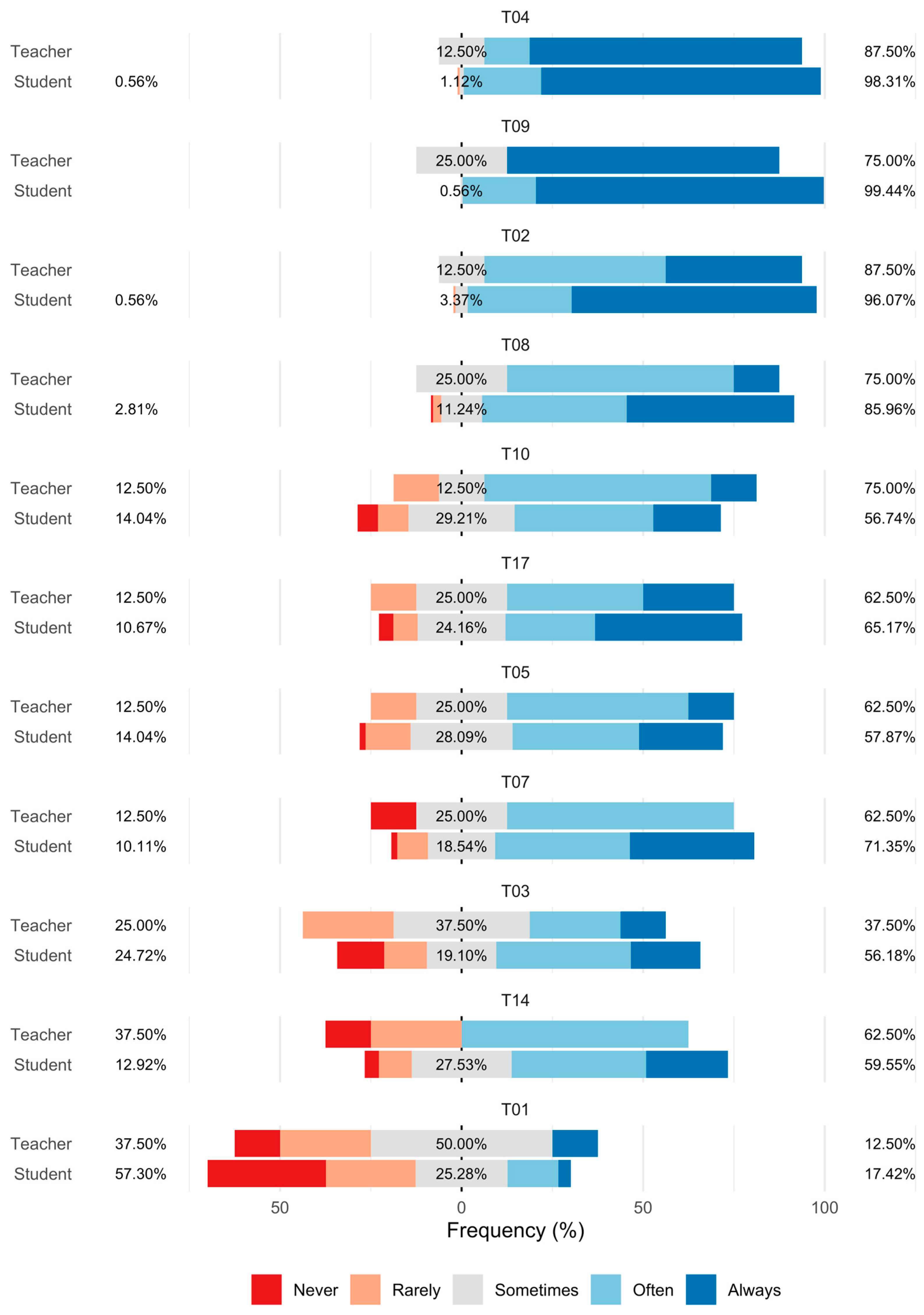Students, when asked about how frequently their teachers implement these activities, generally agreed with their teachers’ perceptions. However, in Brazil, statistically significant differences were found for the activities “T02—Solves exercises on the board” and “T09—Asks if students have questions,” where students reported higher frequencies than teachers did. This discrepancy may reflect either the teachers’ modesty or the students’ overestimation of these activities.