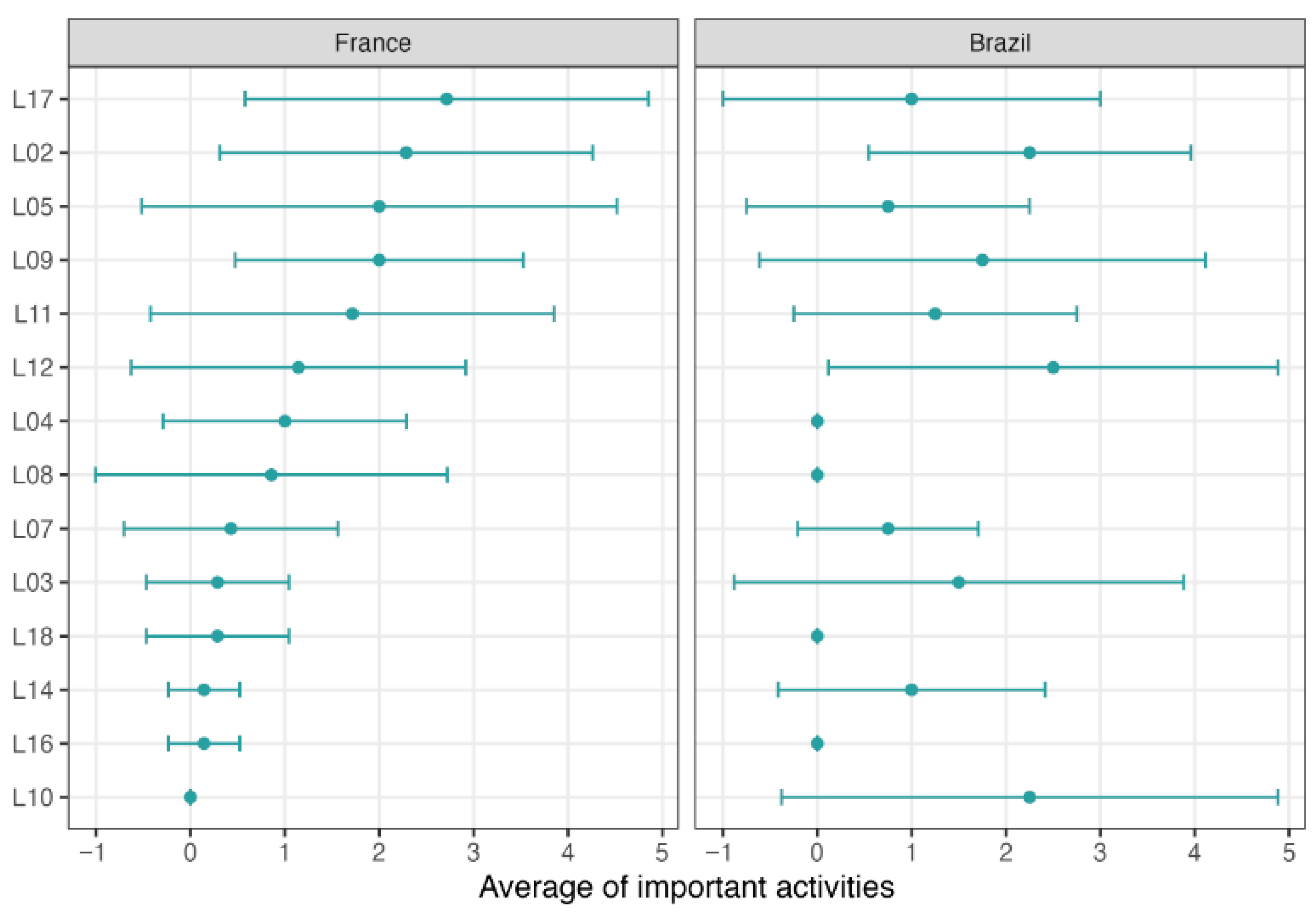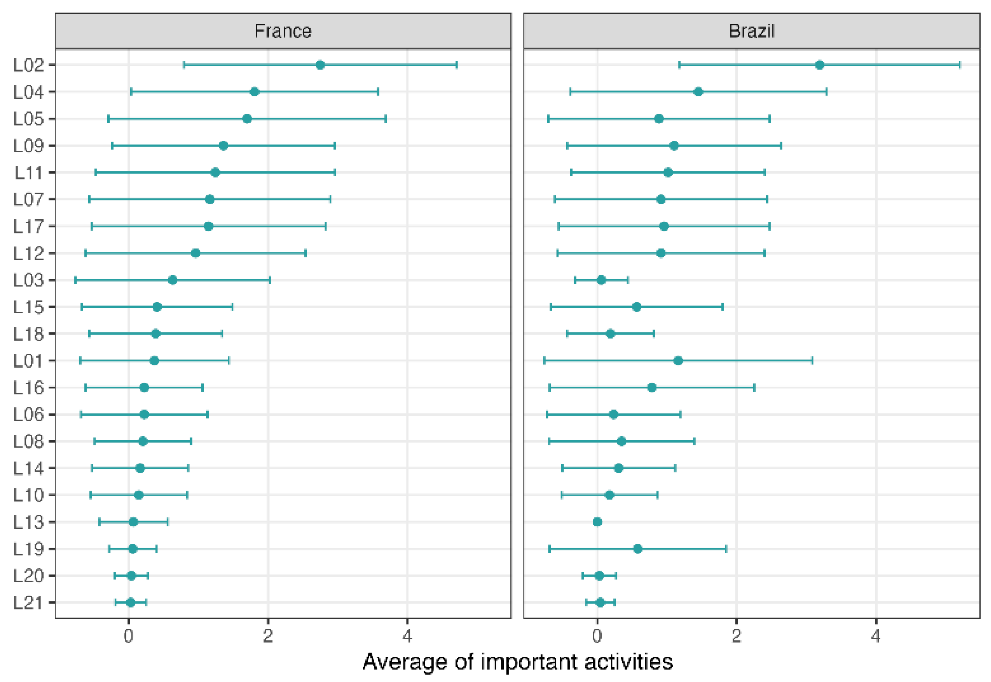 Notably, the activities “L02—Watches the teacher solve exercises on the board” and “L09—Asks questions about their doubts,” mentioned by both French and Brazilian instructors among the top five most important for learning, reflect the necessity of problem-solving and the instructors’ concern that students leave class without lingering questions.