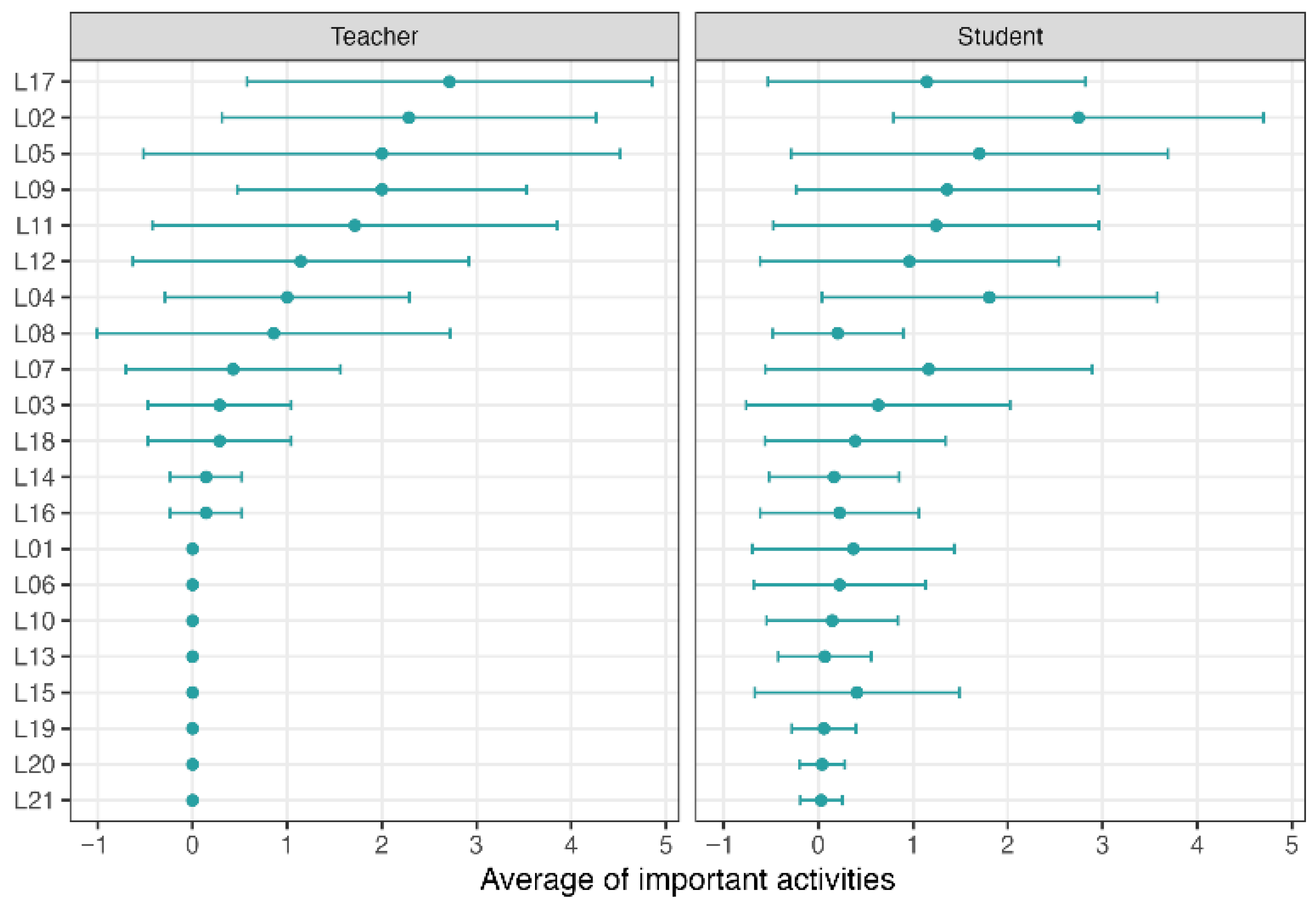 Activities such as “L08—Participate in a discussion with the whole class,” “L14—Explain your reasoning during assessment,” “L10—Explain your reasoning during class,” and “L03—Solve the exercises on the board,” which require some engagement from students and could contribute to active learning, are at the bottom of both lists.