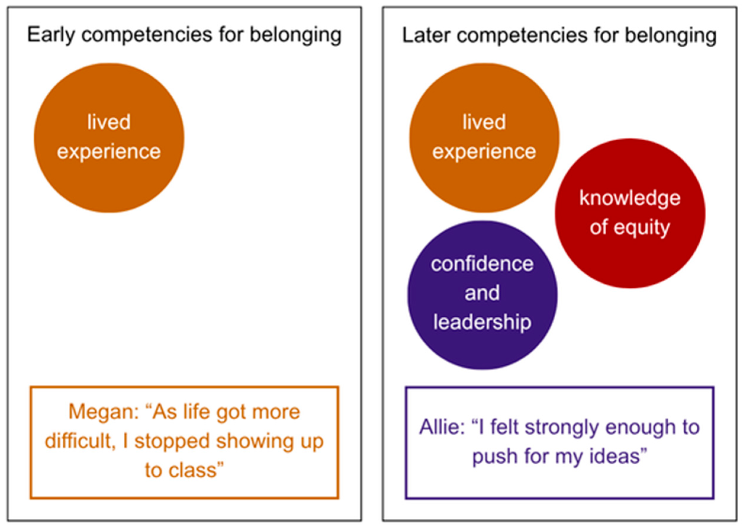 Students entered the NIC with varying competencies for belonging and drew upon their first-hand knowledge of the student experience to make connections and influence the NIC’s goals and direction. Thus, students’ competencies in areas such as mathematics or being a transfer student influenced their sense of belonging in the NIC.