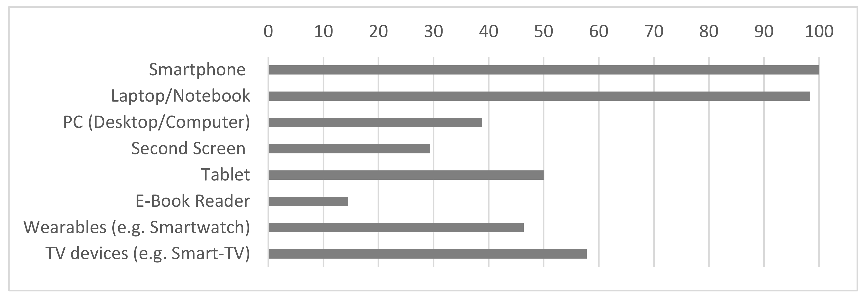 Figure 1). The findings of the initial survey reveal that students own these mobile devices most frequently. In contrast, PCs (39%), TV devices (46%), and wearables (46%) are owned by a portion of students but are used overall significantly less frequently than smartphones and laptops. Strikingly, students have a wide range of devices in their individual learning environments. Accordingly, students report owning an average of 4.1 total digital media, although there are differences in the frequency of use and the respective reasons for use depending on the context.