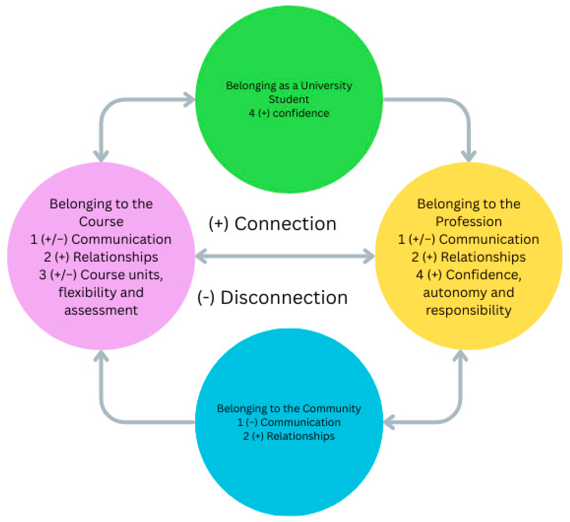 In response to RQ2—What are the factors that facilitate connection or disconnection to university, course, profession, and community belonging?—four main influences on belonging emerged across the university, course, profession, and community: (1) communication; (2) relationships; (3) university study, flexibility, and assessments; and (4) confidence, autonomy, and responsibility. Findings indicate that communication and university study enable or undermine belonging, whereas relationships and growing confidence generally strengthen connections across the four domains and support PSTs’ wellbeing and belonging.
