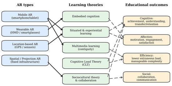 Within the context described above, this paper provides an education-centered narrative review of AR. The primary objective is to support educators, instructional designers, and researchers by clarifying the educationally relevant aspects of AR and by explaining how recurrent AR affordances relate to major learning theories and how these theory-linked mechanisms connect to educational outcomes across domains (e.g., STEM, humanities, and arts).