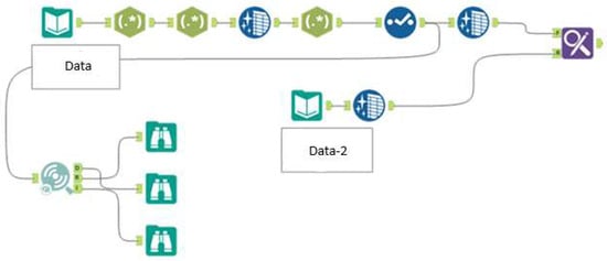 Alteryx allows users to extract, merge, manipulate, analyze, and present data from multiple sources without writing code. Its intuitive, no-code interface (drag and drop type of platform) supports users of all skill levels and integrates data preprocessing and predictive analytics functions. It operates by linking visual tools representing specific tasks such as importing, cleaning, transforming, analyzing, and exporting data. Users can combine these tools into workflows to prepare datasets, run predictive models, and visualize results. For example, a sample workflow provided in Figure 1 combines two datasets using a series of regular expressions, filtering, and cleaning operations. The platform serves as a modern alternative to traditional programming environments, offering accessibility to users lacking technical expertise.