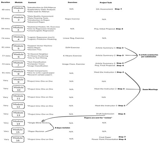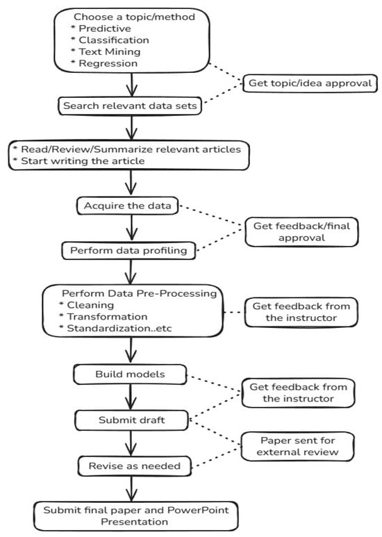 This graduate course is offered in two modalities: hybrid and online. It is structured so that during the first seven weeks, students in both sections, engage with and practice the course materials on the online learning platform (e.g., watching lecture videos, completing practices). The lecture videos are designed for students with no prior background in data analytics. They use animations and clear explanations (e.g., https://www.youtube.com/watch?v=4wI0xAuz59A, accessed on 2 November 2025) to simplify complex and technical concepts. In the second half of the semester, students then focus on their projects, receiving one-on-one guidance from the instructor, as detailed in the following sections.