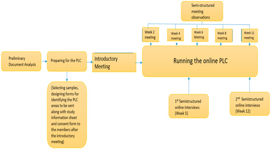 The interviews were conducted at different points during the study, i.e., in the middle of the semester and at the end of the semester, to gain a deeper understanding of how the members viewed the PLC at different points in their experience (see Figure 2). All the interviews were recorded. The interviews were semistructured to not only ensure maintaining the focus on what the research aimed to answer but also allow the flexibility to ask other questions, depending on how members responded. In addition, some interview questions were adapted or specialised based on the data gathered from the observations. The questions were general and open to elicit as much information as possible from the members. They mostly focused on the teaching approaches of the members, what they learned from this experience, how they conceptualised the PLC, whether they could see an influence on student learning, and how this experience could be improved. There were also questions derived from the characteristics of PLCs discussed in the literature review. Each interview lasted for around 40–60 min.