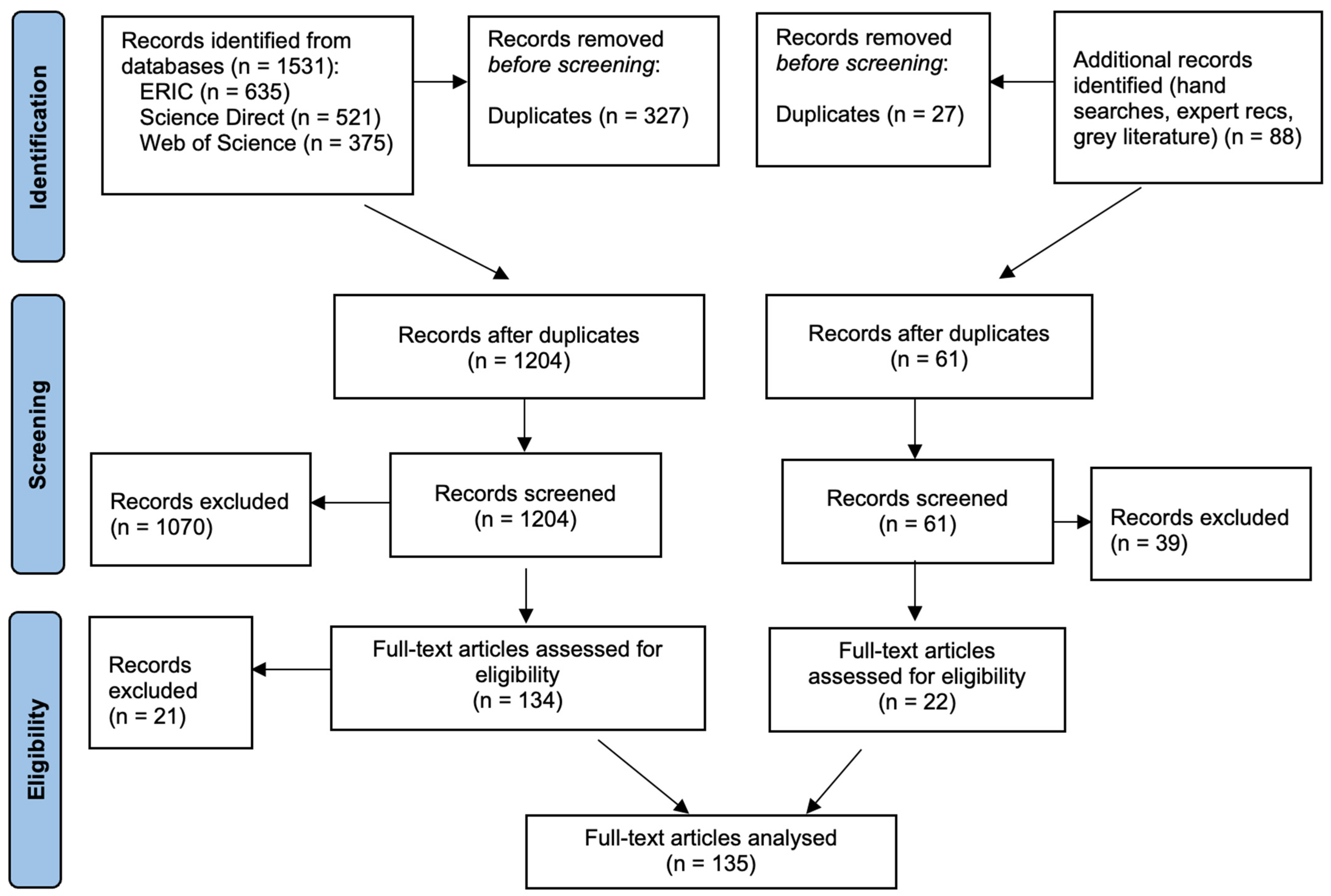 These combined efforts from the expert-elicitation search and the hand search of journals yielded an additional 88 studies. Of these, 27 were duplicates (already identified in the initial pool), and 39 were excluded based on the same inclusion/exclusion criteria described earlier. The remaining 22 were included for full analysis, bringing the total number of studies analysed to 135.