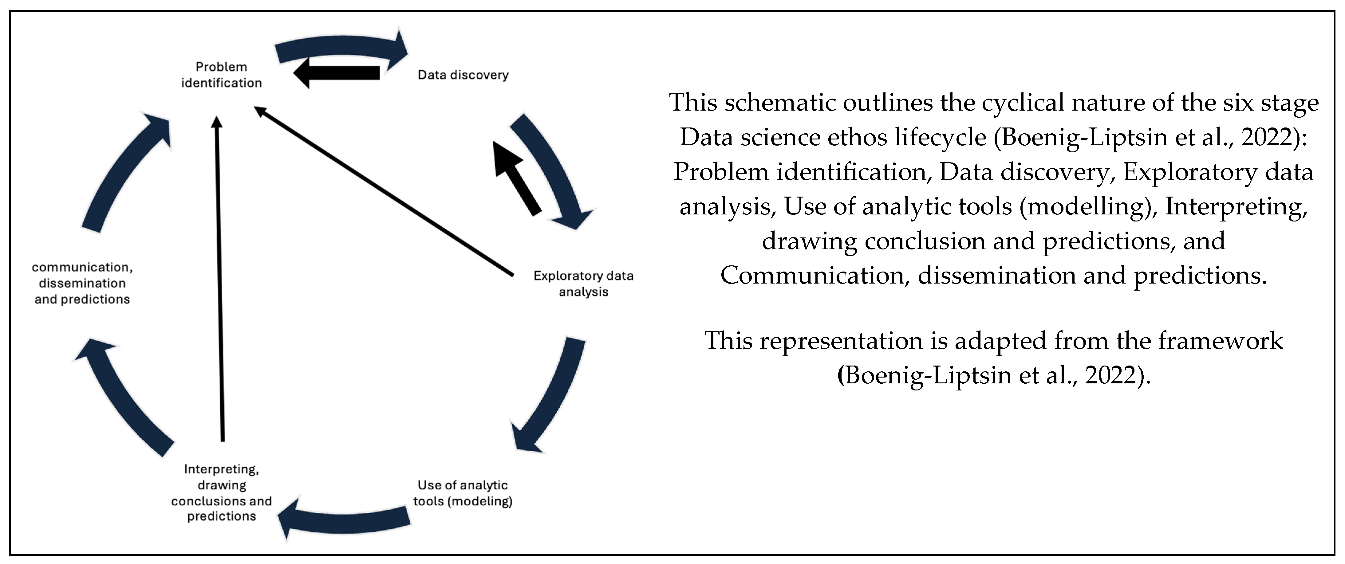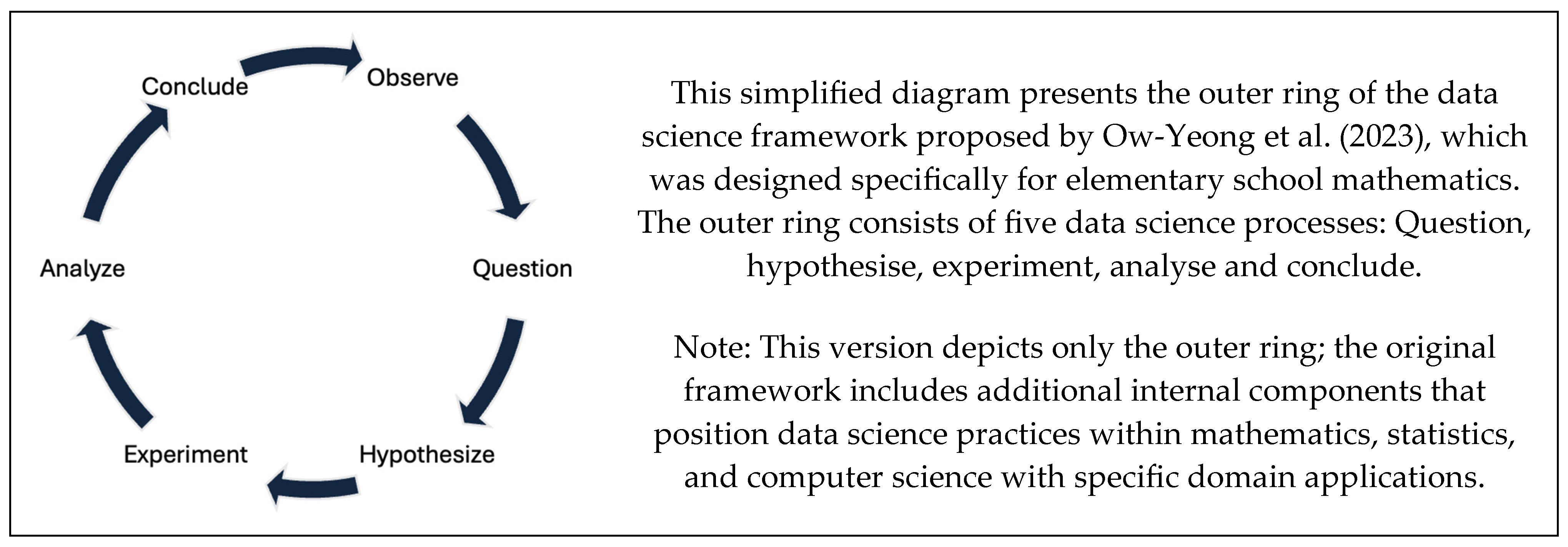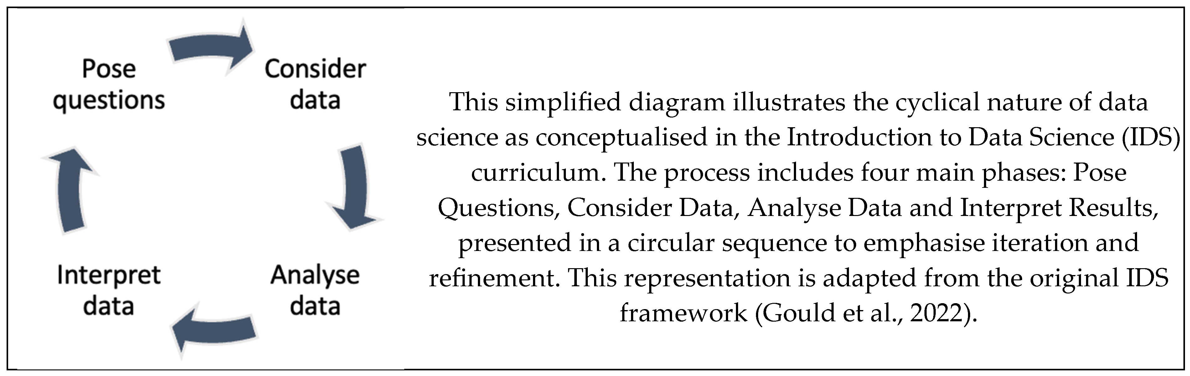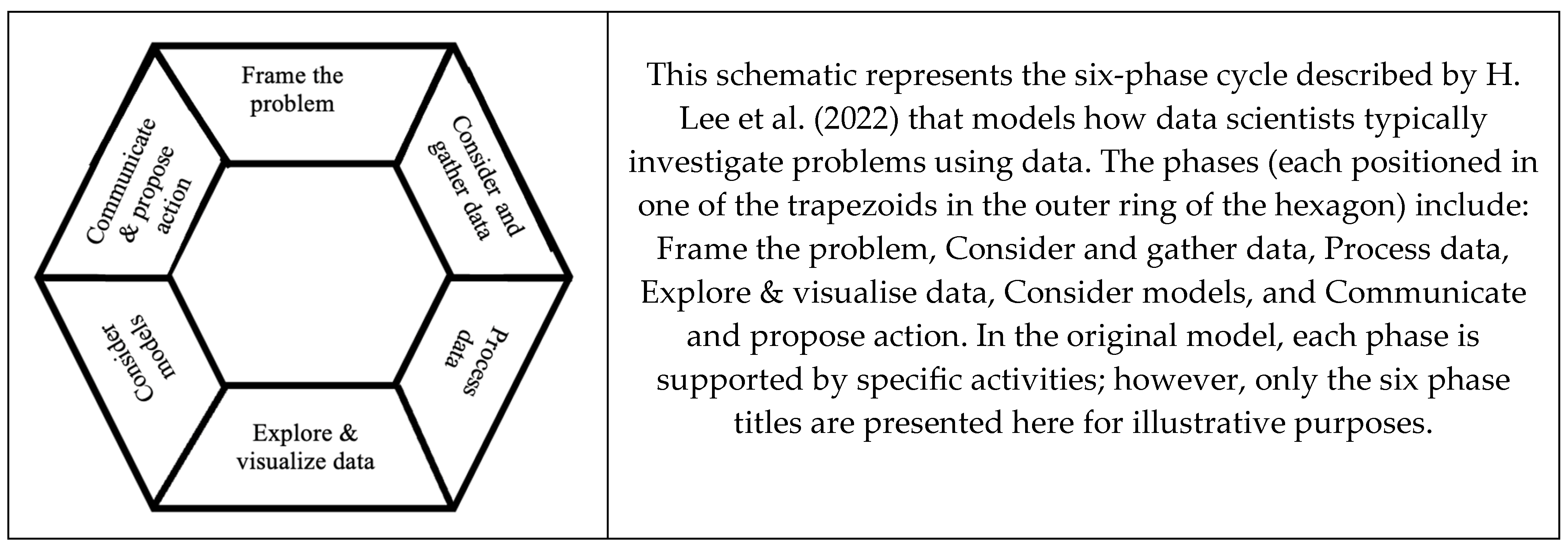 https://instepwithdata.org] accessed on 1 January 2026) and statistical inquiry. We examined how these components could be meaningfully grouped, seeking to identify recurring sequences or cycles of activity that define data science engagement.