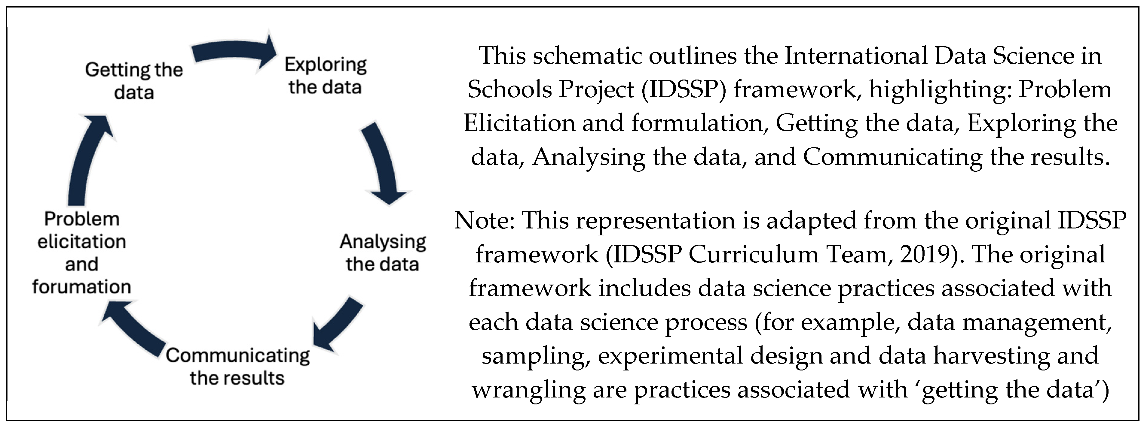 H. Lee et al., 2022), the EDUCATE framework was explicitly developed for use within initial teacher education, targeting pre-service teachers as non-specialist learners who are preparing to teach data science at the school level. To meet the needs of this audience, in contrast to frameworks comprising five or six distinct steps (