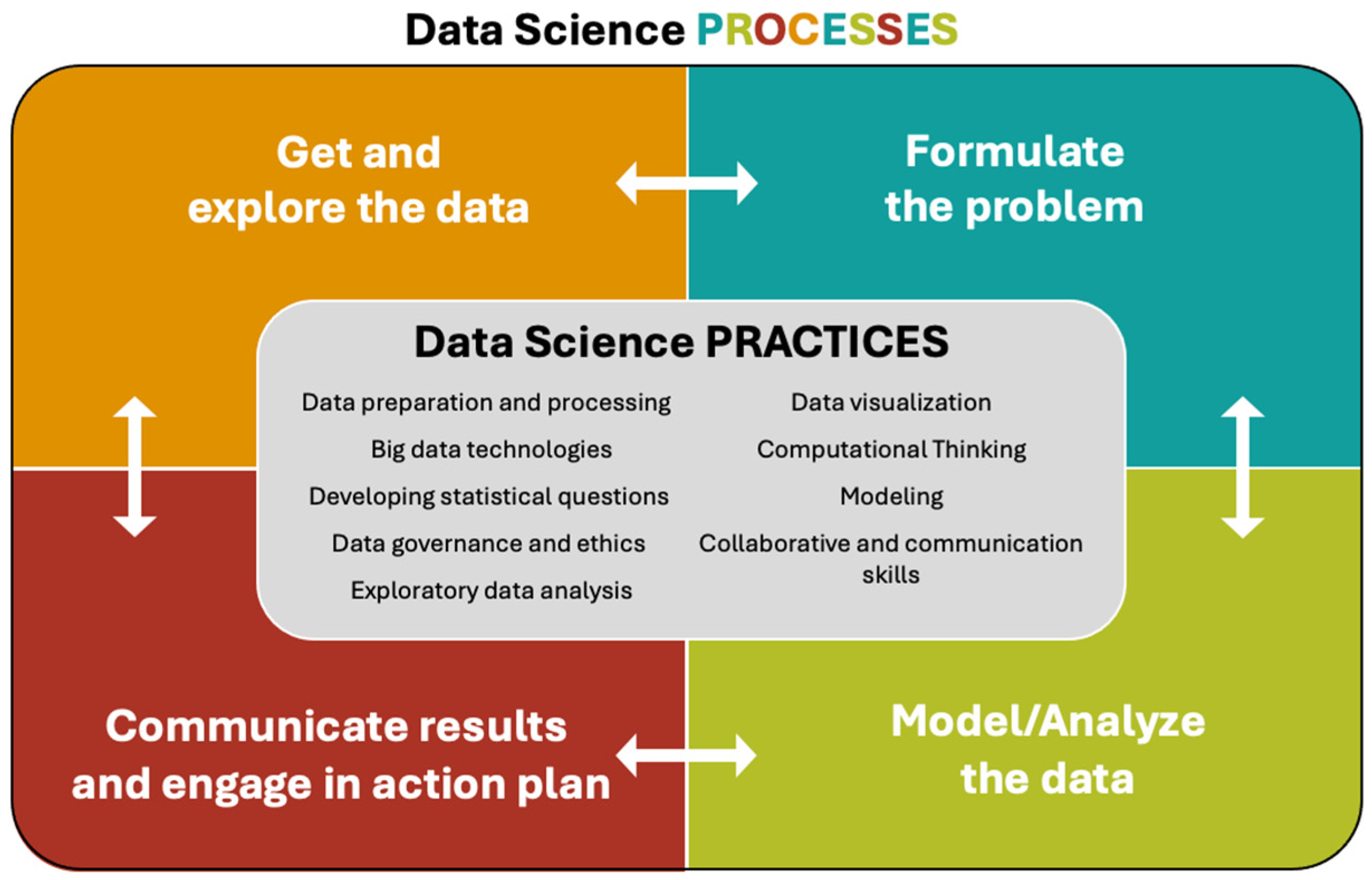 This process led to the formulation of four overarching processes (Problem Formulation, Preparation, Analysis, and Interpretation & Communication) that represent the structural phases of a data science investigation. The remaining components were conceptualised as nine cross-cutting practices (e.g., computational thinking, ethical reasoning, and data visualisation) which support and enrich each stage of the process. This distinction was strongly informed by