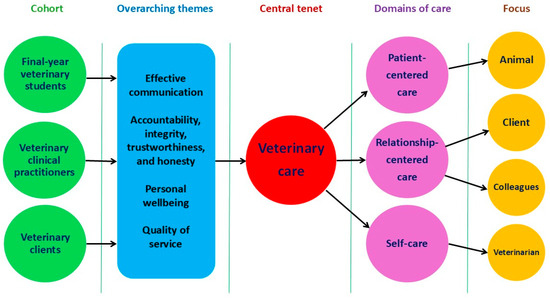 Diagram illustrating the association between the three domains of veterinary care and the four overarching themes.
