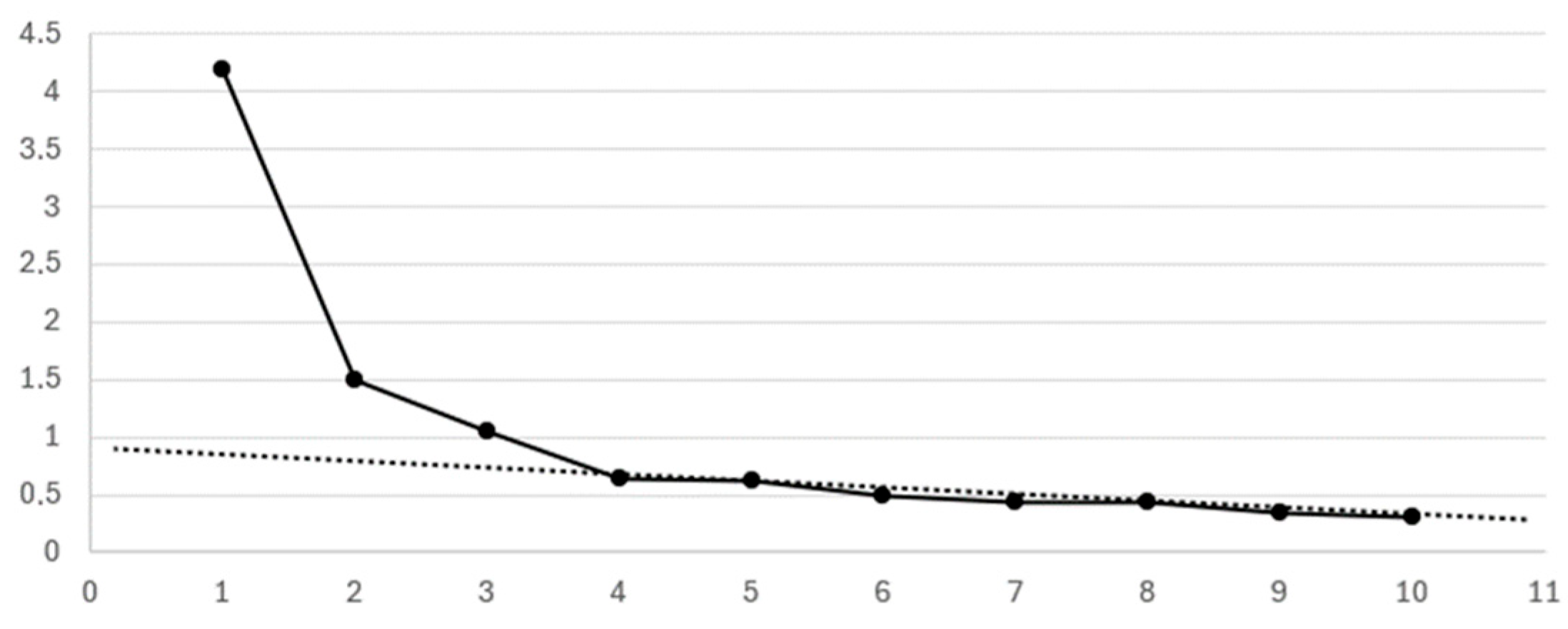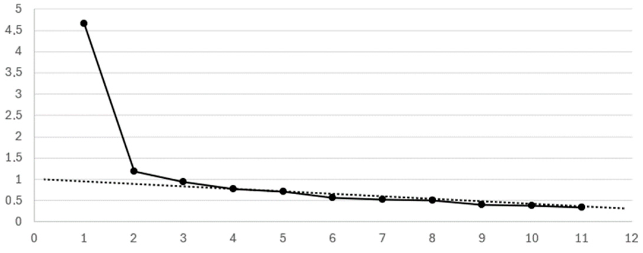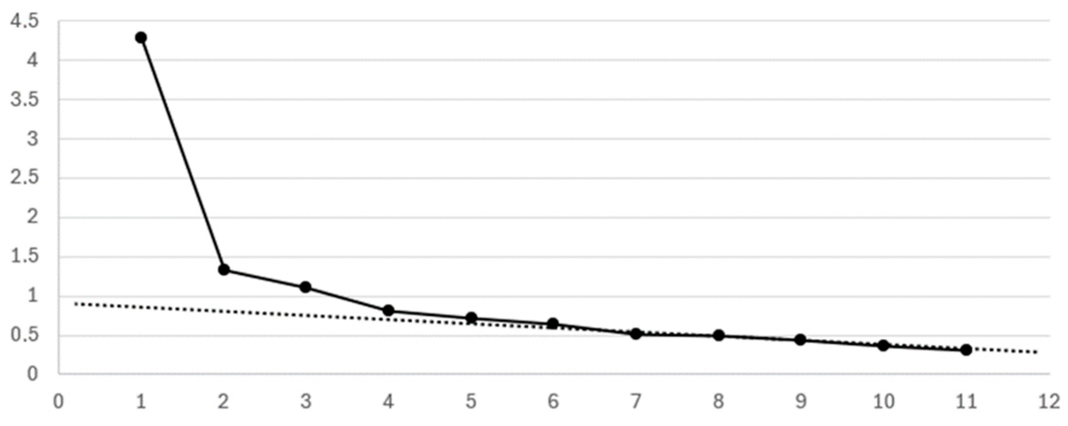 - Eigenvalues: First, Table 5, Table 7, Table 9, and Table 11 present the eigenvalues. According to the Kaiser criterion, factors should have eigenvalues of 1.0 or higher. The last factor meeting this criterion is highlighted in bold in each table, indicating the number of factors to be used in the factor analysis.