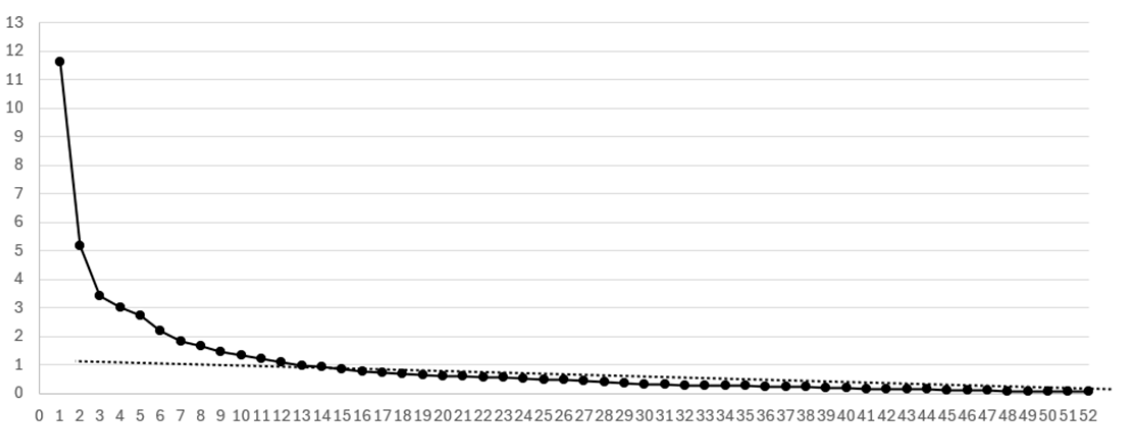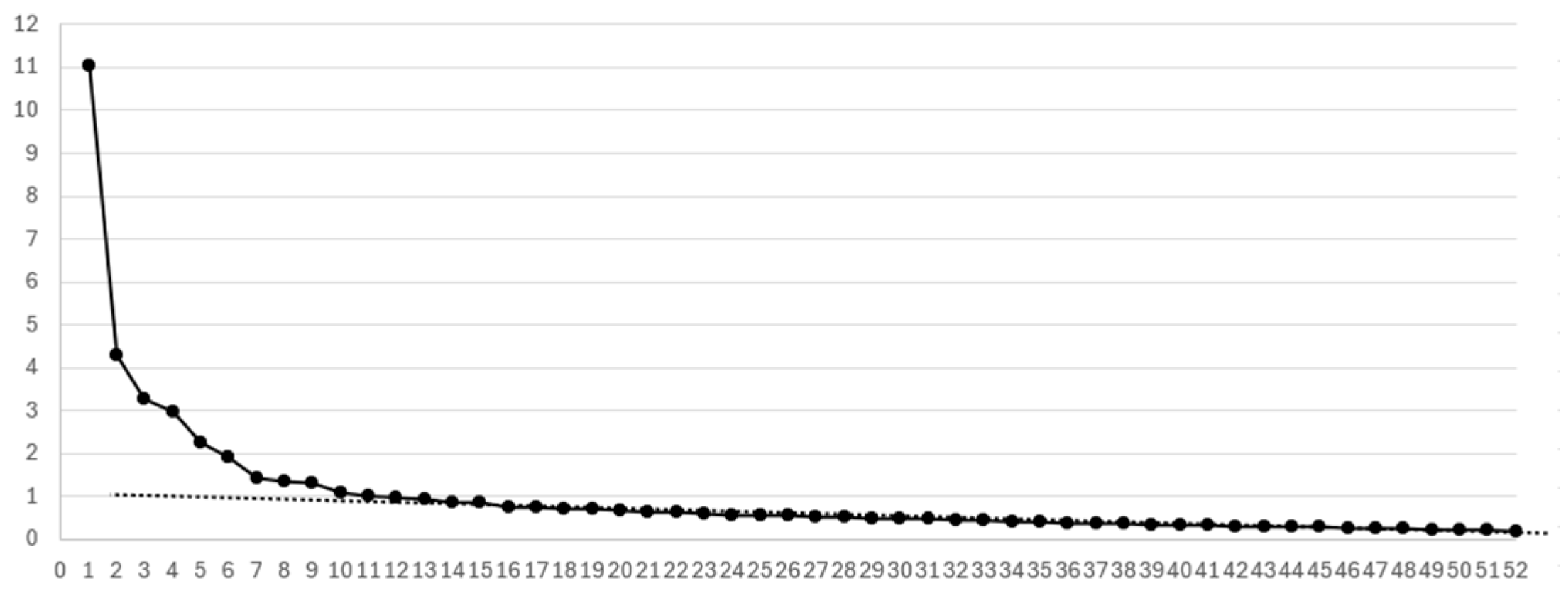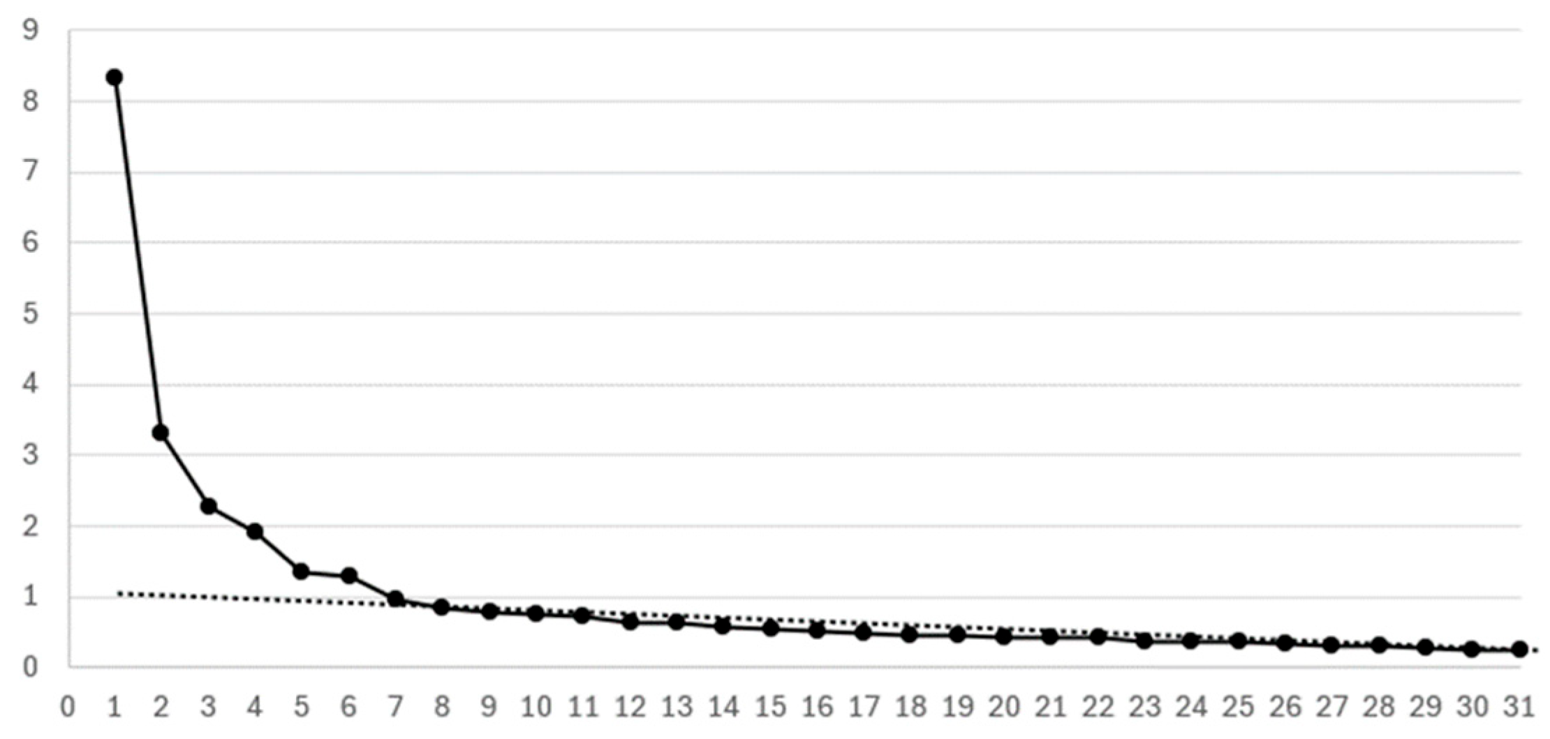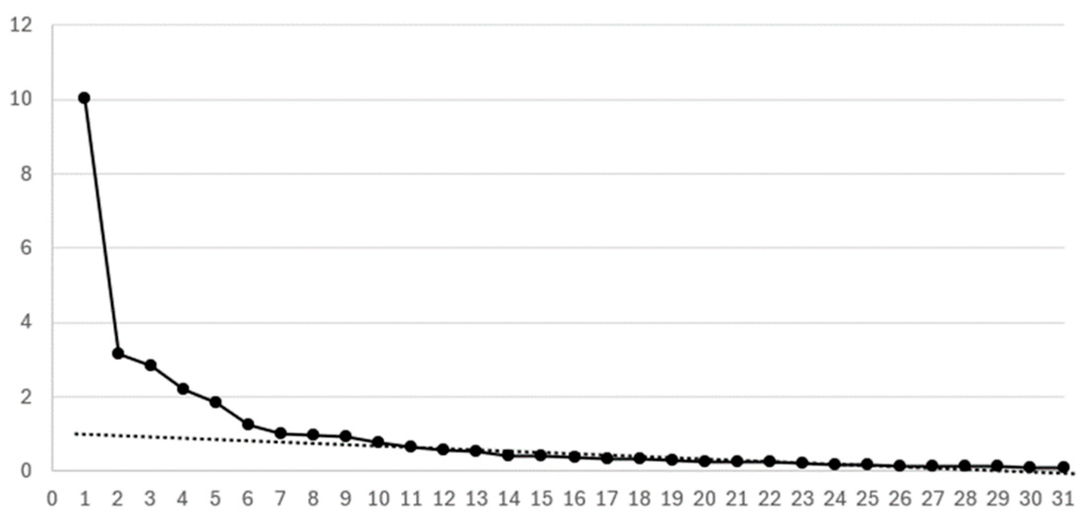 - Eigenvalues: First, Table 5, Table 7, Table 9, and Table 11 present the eigenvalues. According to the Kaiser criterion, factors should have eigenvalues of 1.0 or higher. The last factor meeting this criterion is highlighted in bold in each table, indicating the number of factors to be used in the factor analysis.