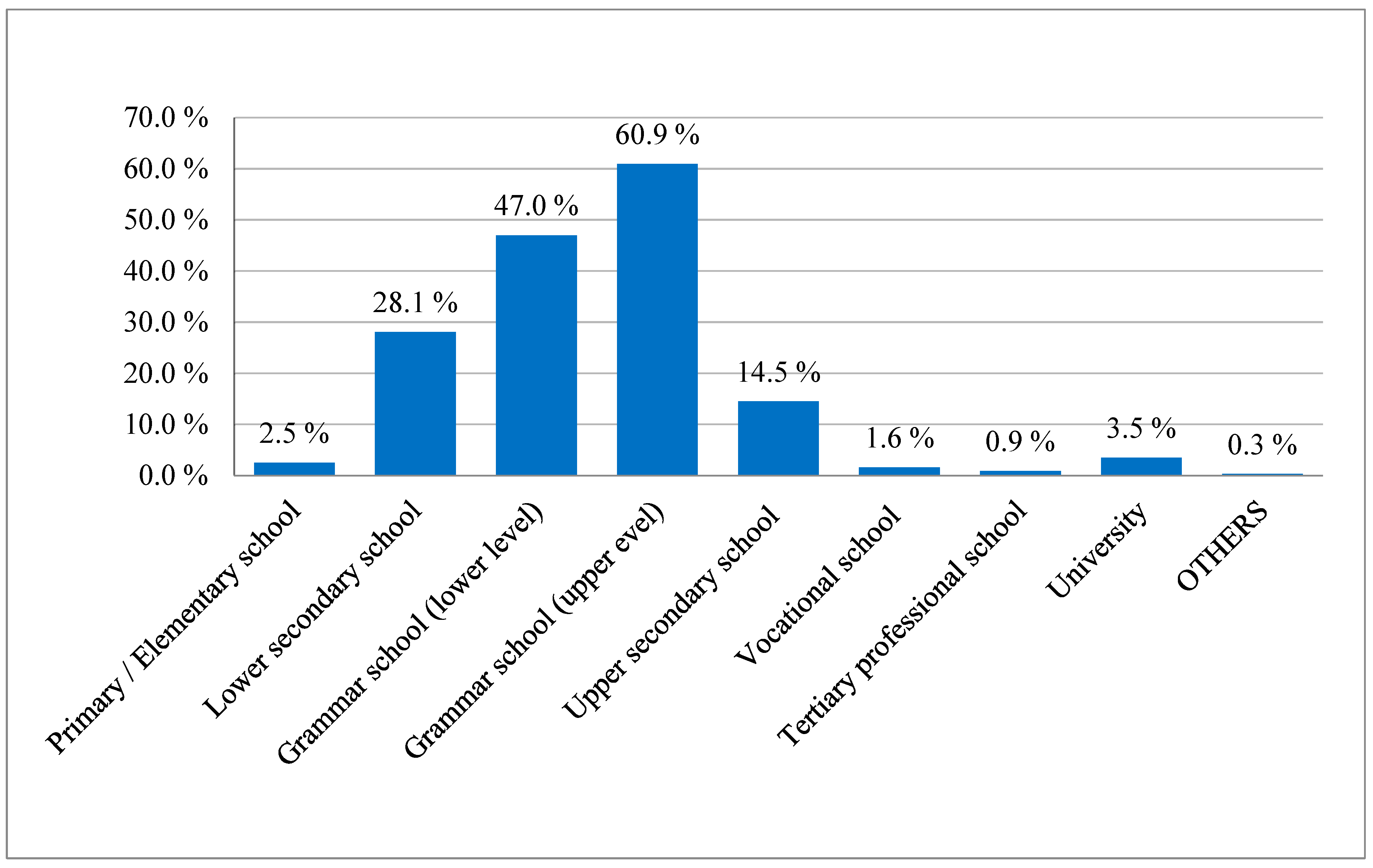 Figure 2. Distribution of teachers by school type, N = 317 (2025). Most respondents worked at grammar schools (47% lower level, 60.9% upper level), followed by lower secondary schools (28.1%) and vocational schools (14.5%). As some teachers taught at more than one school type, percentages exceed 100%.