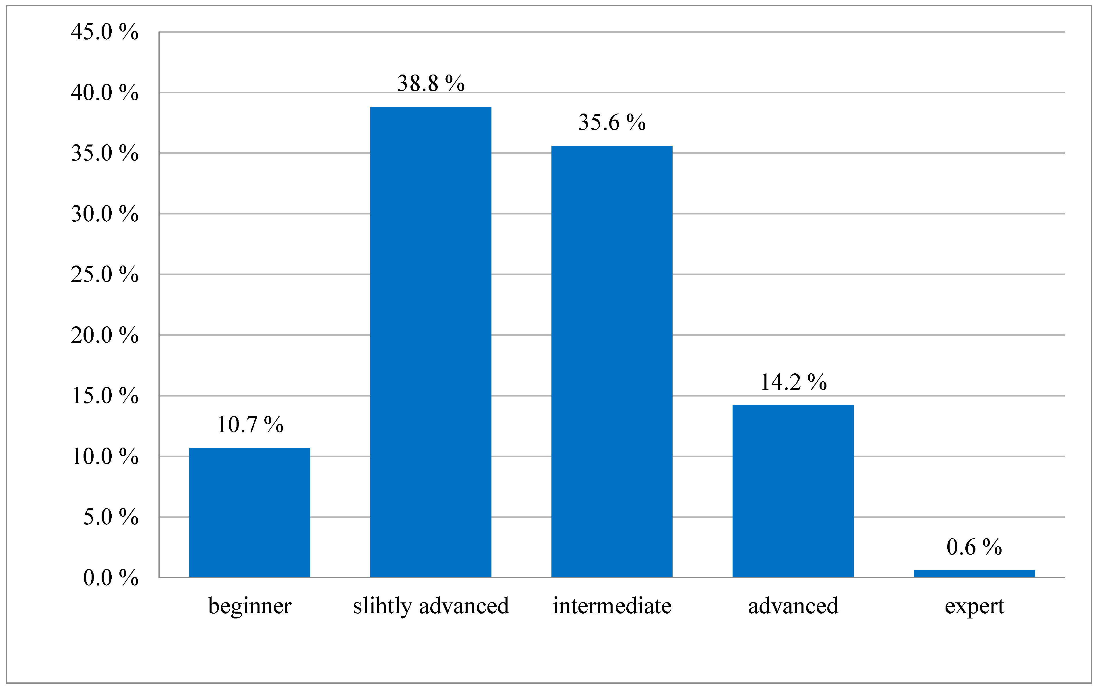 Figure 3. Teachers’ self-assessed levels of experience with AI, N = 317 (2025). Nearly 90% of teachers reported at least basic experience with AI, with most identifying as slightly advanced or intermediate users.