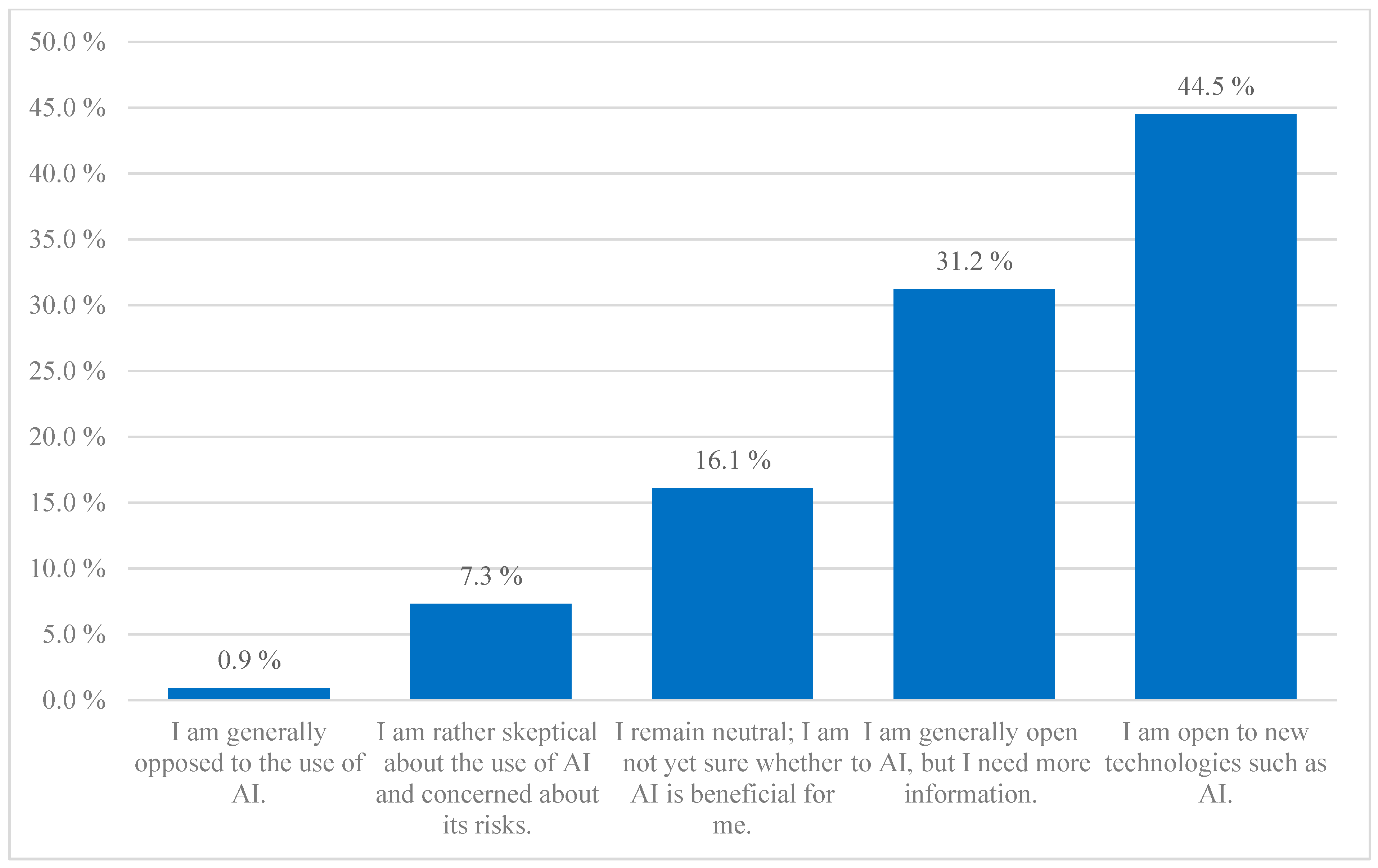 Figure 4. Teachers’ attitudes toward AI, N = 317 (2025). Most teachers expressed positive attitudes toward AI, with nearly three-quarters reporting openness or positive views, while only a small minority were skeptical or rejecting.