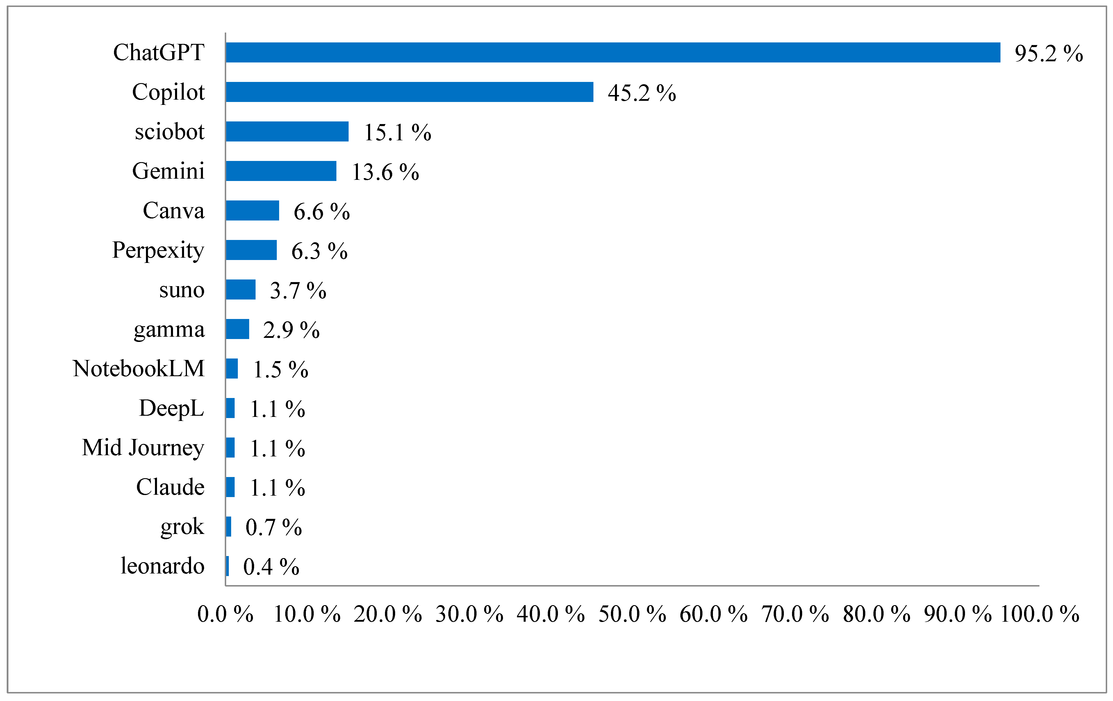 Figure 5. Most frequently used AI tools among teachers, N = 274 (2025). ChatGPT dominated usage (95.2%), followed by Copilot (45.2%) and other tools used at lower rates.