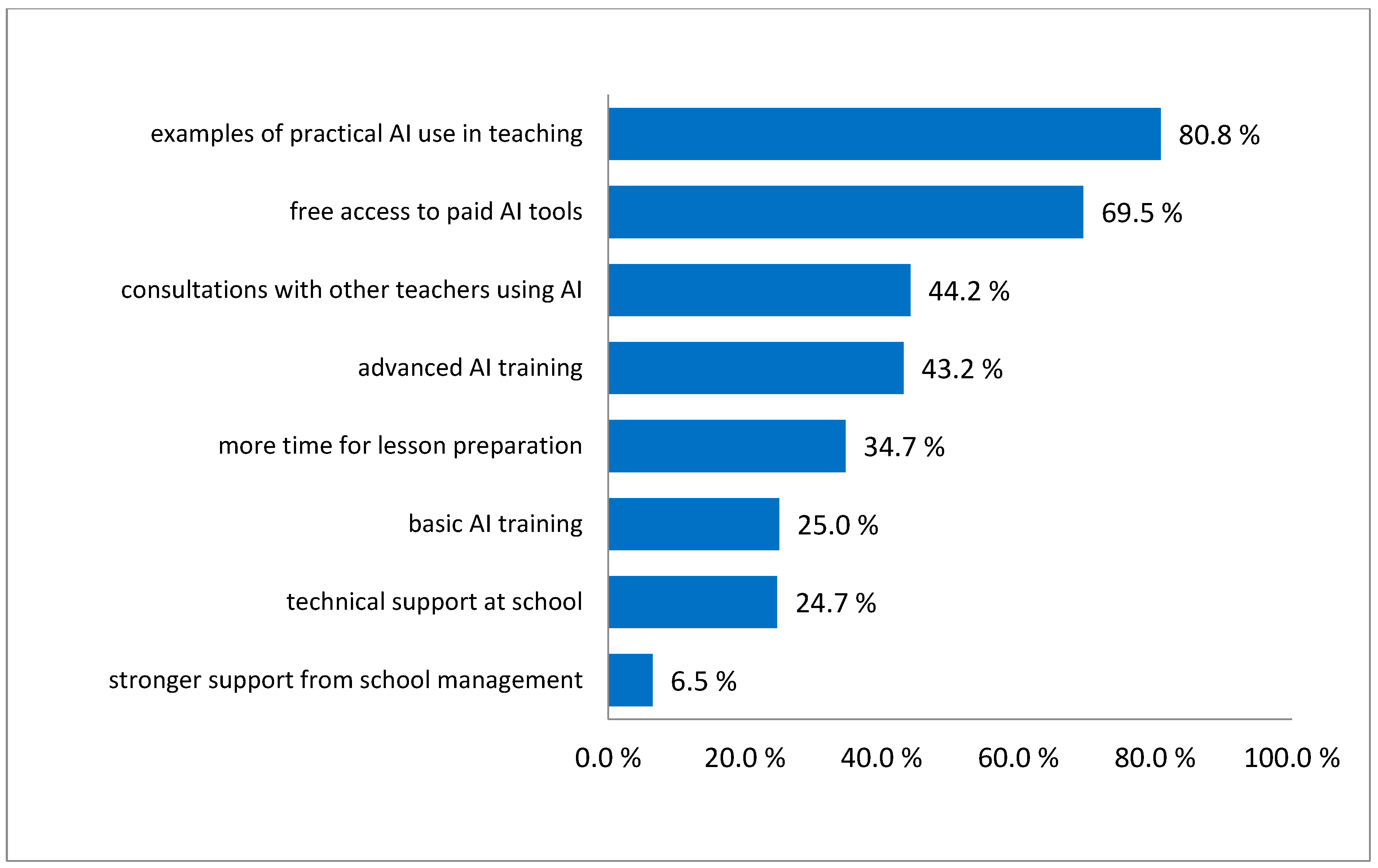 There are significant differences in confidence and knowledge in the field of AI among teachers, especially between different levels of education. Primary school teachers call for basic skills and orientation in AI issues, while higher-level teachers demand methodological strategies, tools for effective use of AI, and systems for detecting unethical student behavior (Chen et al., 2025; Ding et al., 2024; Traga Philippakos & Rocconi, 2025). What is common to all school levels is that teachers feel a strong need for training in the field of artificial intelligence and its pedagogical integration.