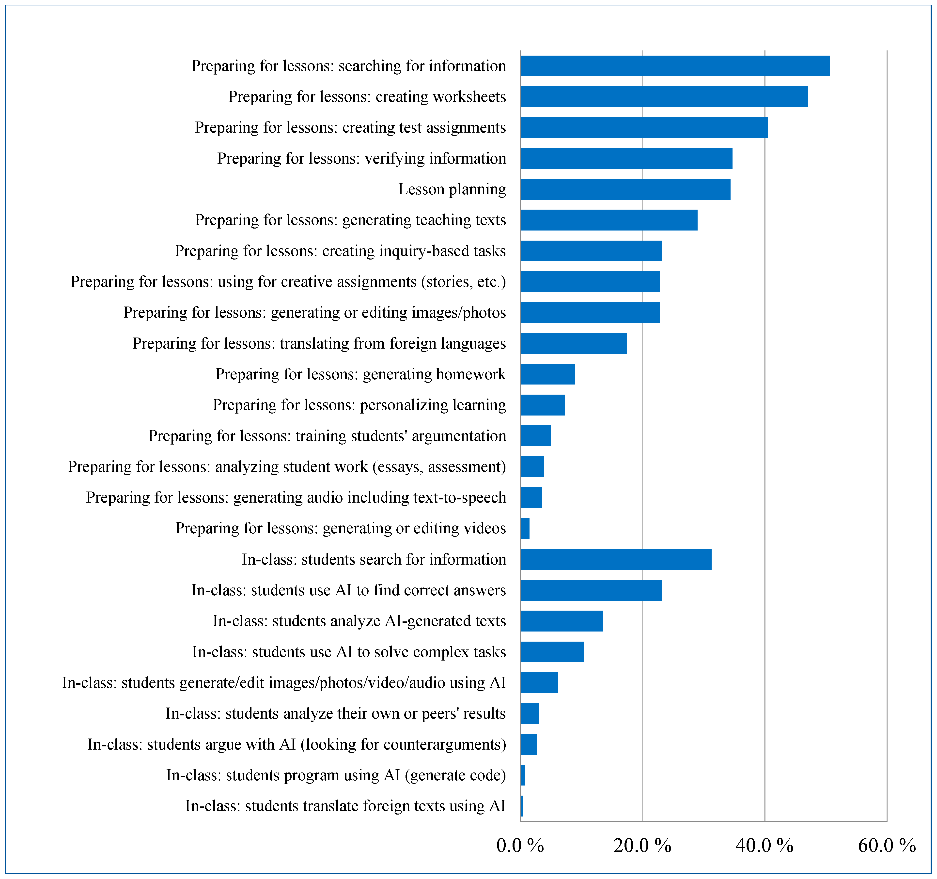 Empirical research from recent years shows that, although teachers’ awareness and positive attitudes towards AI are increasing significantly, practical experiences with its integration into teaching remain uneven (Chen et al., 2025; Ding et al., 2024; Efe & Aslan Efe, 2025). Most teachers use AI tools primarily for lesson preparation, material creation, and administrative activities, while direct integration into the teaching process is still rather exceptional (Chen et al., 2025; Ding et al., 2024). Teachers report using generative tools primarily for information retrieval, test generation, writing assessment materials, and as a source of inspiration for classroom activities (Efe & Aslan Efe, 2025).