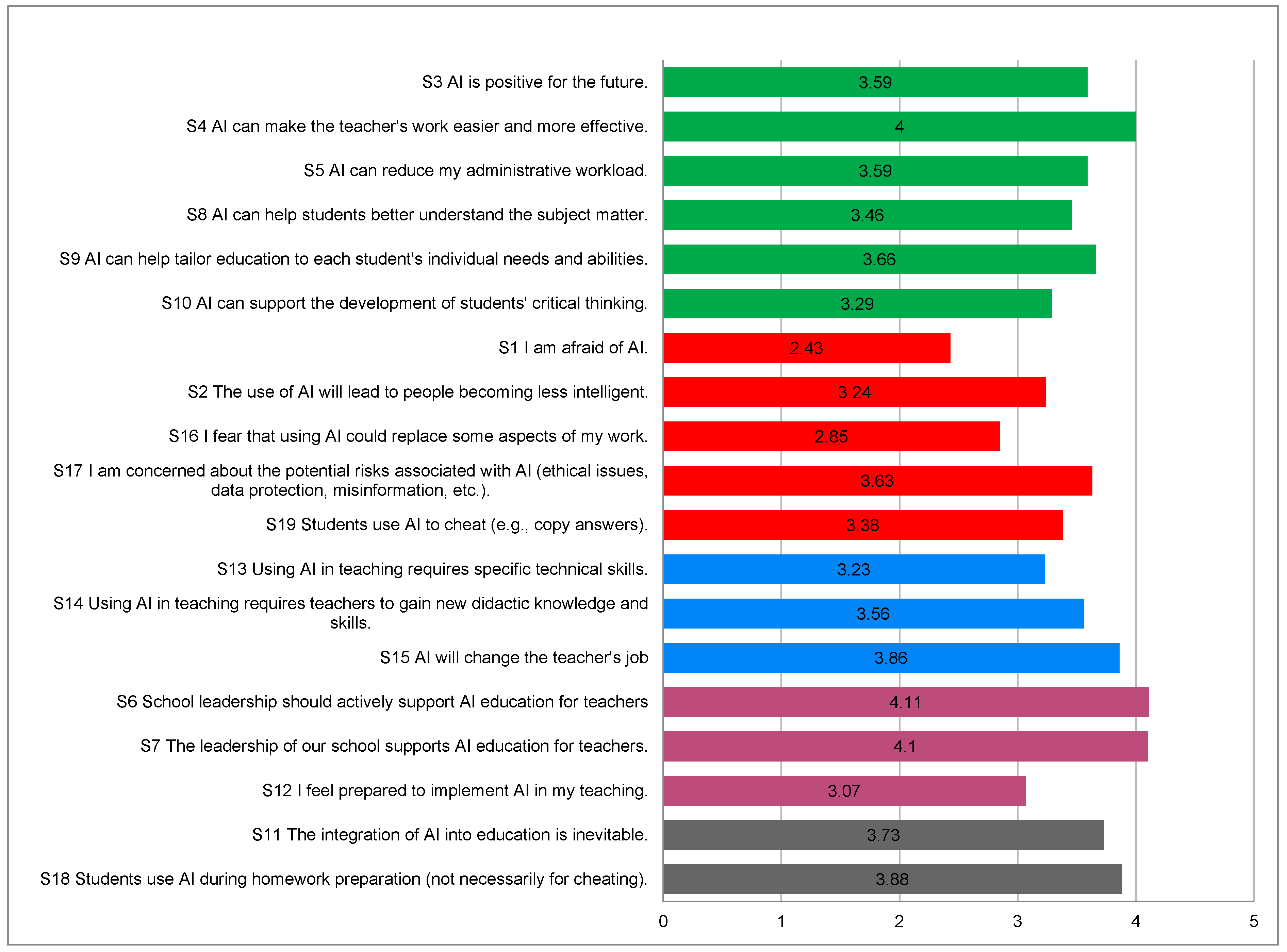 S6: School leadership should actively support AI education for teachers 80.4% agree/4.4% disagree4.114Institutional support for teacher training in AI is widely viewed as essential.