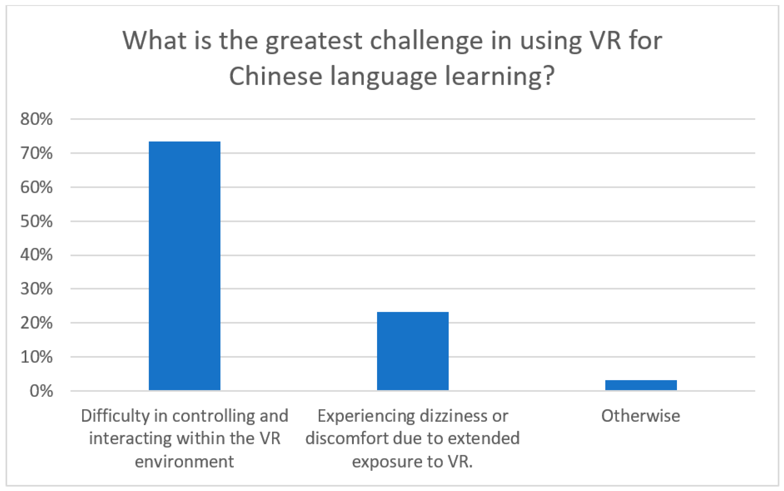 Students reported various challenges in using VR. The majority (73.33%) found it difficult to control or interact in the VR environment, 23.33% experienced dizziness or discomfort, and 3.33% noted other minor issues.