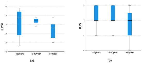 Box-and-whisker plots showing the distribution of scores for the practical dimension (a) and the viability dimension (b) according to years of teaching experience (<5 years, 5–10 years, >10 years). The plots display median values, interquartile ranges, and overall score dispersion across experience groups.