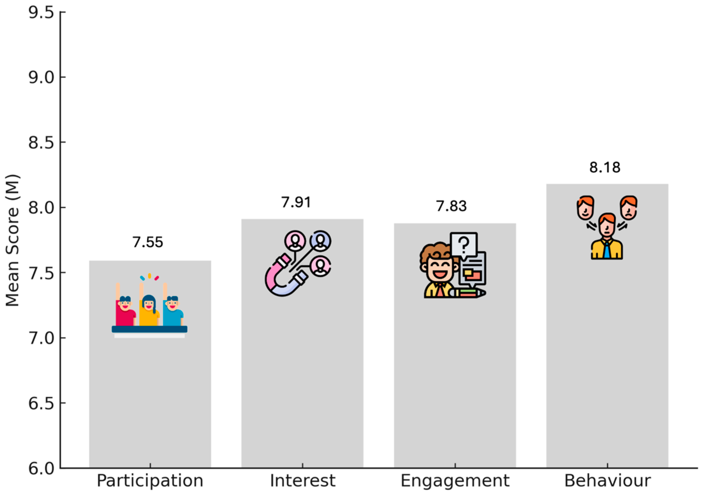 SD = 1.25), indicating that most groups consistently adhered to rules, collaborated effectively, and demonstrated respectful classroom conduct. Ratings for Interest (