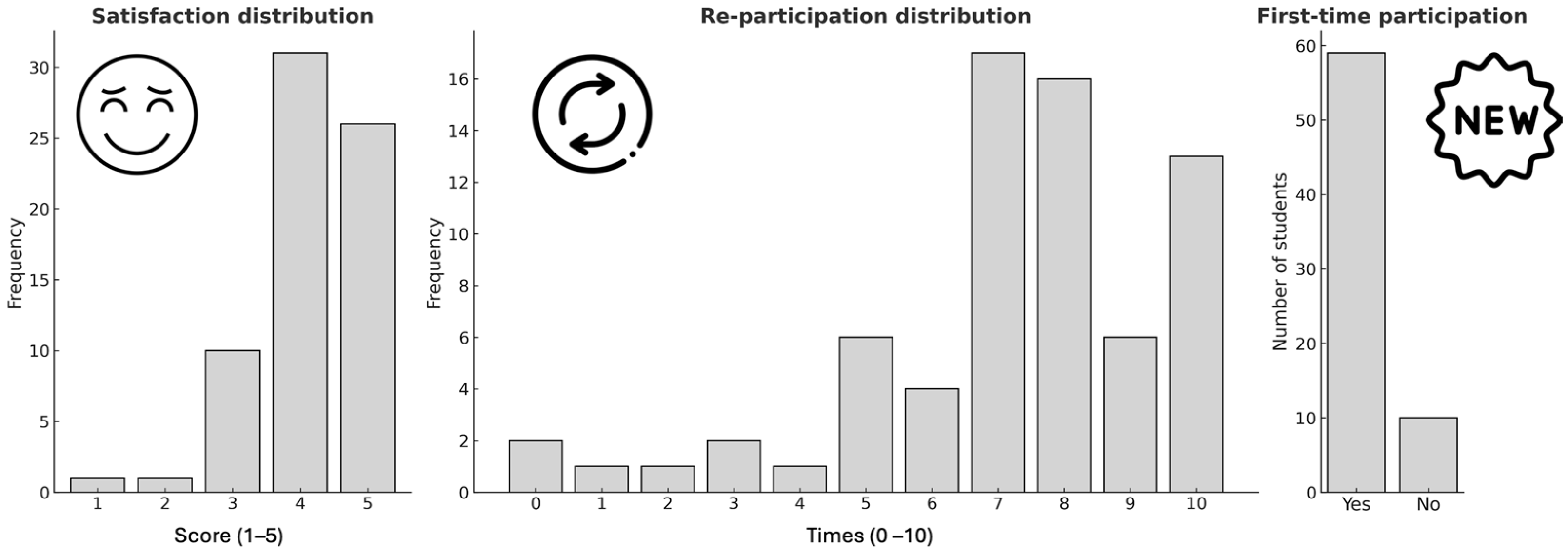 Finally, the right panel shows that most students were first-time participants (Yes; 85.5%), yet their evaluations were comparably positive, indicating that the activity was engaging regardless of prior experience.