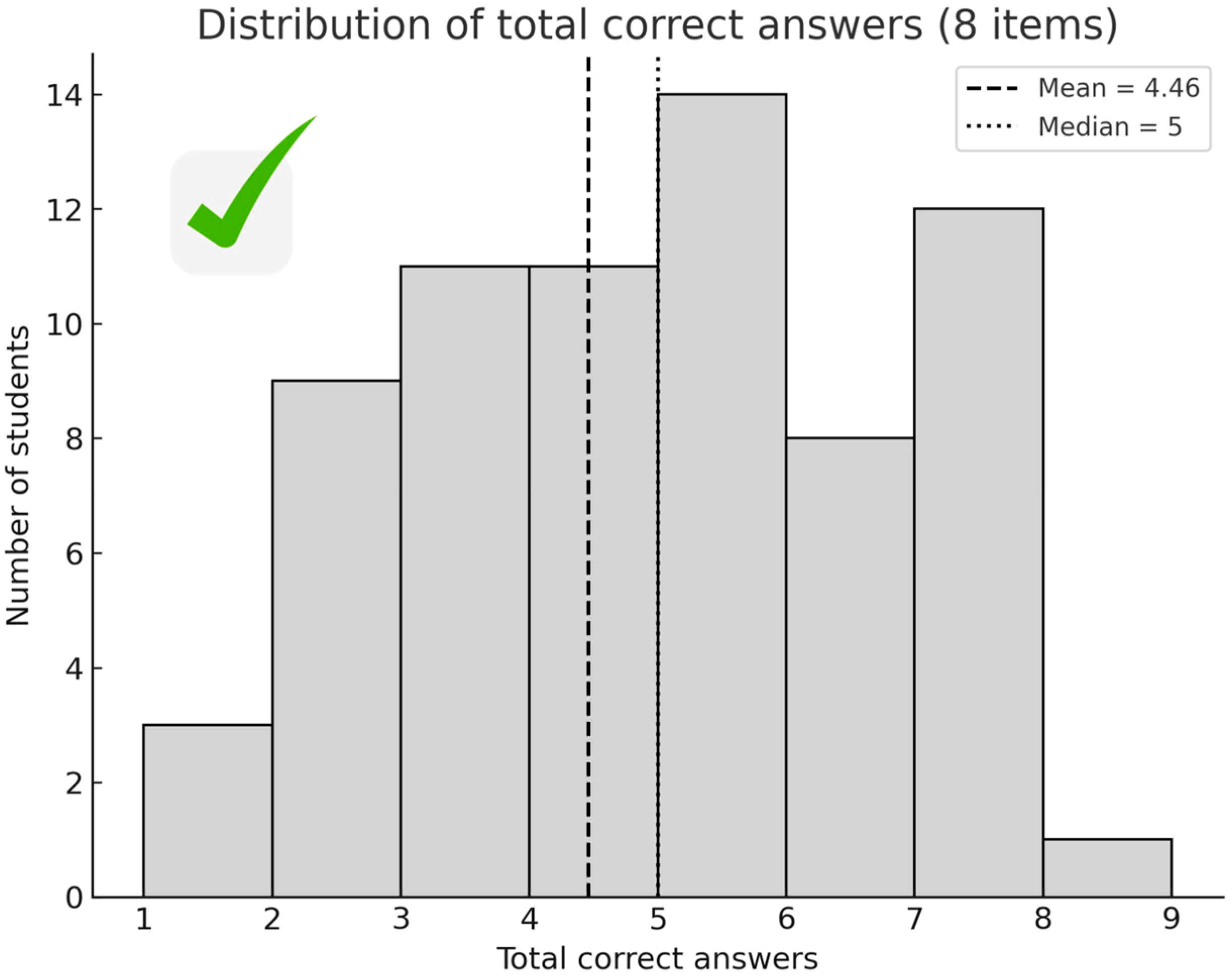 SD = 1.84). The median score was 5, with scores ranging from 1 to 8. Interquartile values showed that 50% of students obtained between 3 and 6 correct answers. These results suggest variability in knowledge acquisition, with some students demonstrating high accuracy while others exhibited substantial difficulties (