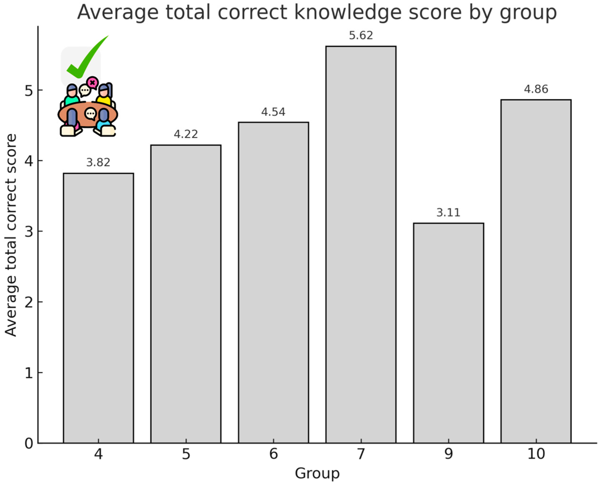 M = 5.62 (Group 7). All groups except Groups 4 and 9 answered on average more than 50% of the questions correctly (