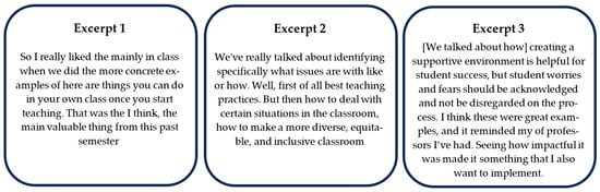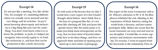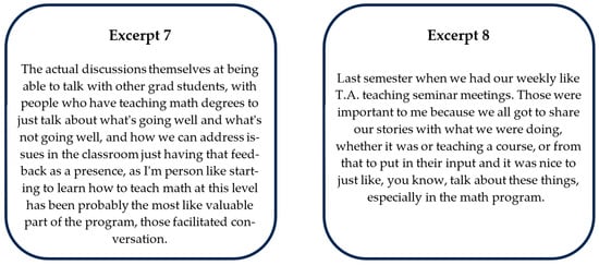 As a demonstrative example, when responding to an interview question about how the PD has helped them thus far, GTAs explicitly mentioned their appreciation of being able to talk to others who were in similar positions as they were (Figure 4). The GTAs stated how useful it was to have the space to “talk with other grad students,” whereas another GTA remarked about how important it was to them to share and listen to everyone’s stories. These GTAs specifically valued having a space to talk about the courses they were teaching, and as Excerpt 8 seems to indicate, is perhaps missing from the weekly routine “in the math program.” This finding aligns with current research on PD for teachers. Since cohorts of GTAs often teach the same classes, GTAs have an organic interest in forming a Community of Practice (CoP) around teaching in their respective disciplines. As a CoP, the GTAs share their teaching experiences and support one another in navigating pedagogical challenges. These kinds of interactions within a CoP have been consistently observed as being effective in promoting pedagogical development in new teachers (K. G. Johnson et al., 2021; Quaisley, 2023; Townley, 2020; Tseng & Kuo, 2014). Therefore, from both the literature and our data, an important process of curricular design for DEI PD involves intentional opportunities to collaborate.