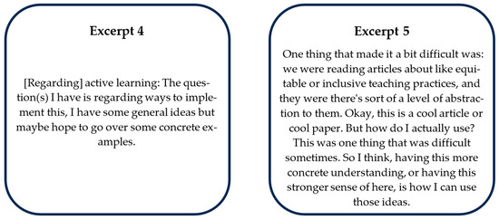Echoing the favorability of having concrete examples, GTAs also felt that some of the PD activities did not have enough examples, and they often remarked how abstract or difficult it was to connect theory to their current roles (Figure 2). While the GTAs did not usually find the theory or general ideas unrelatable to their courses, there was a repeated sentiment that they wanted more “concrete examples” since they only got a sense of the general idea of the topic [Excerpt 14]. Even when articles talked about equitable or inclusive teaching practices, sometimes the GTAs felt that they were not completely connected to their own teaching and that they wanted “more concrete understanding” [Excerpt 15]. This was a common sentiment in the earlier design stages of the PD course, where GTAs indicated areas of improvement such as “provide more explicit examples of common concerns and possible solutions, or of educators actively using effective strategies”. We find this in alignment with our first theme since their concerns voiced a desire that the content of the PD should involve specific examples connected to the larger abstract pedagogical theories.