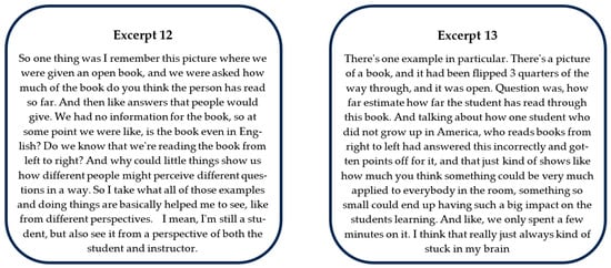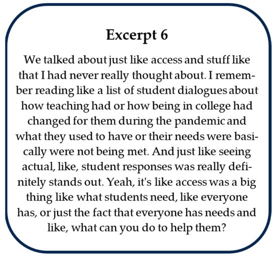 GTAs also referred to specific examples of activities during their end-of-year interviews or surveys about the class. In these end-of-year interviews, the GTAs were asked what they thought had an impact on them throughout the PD course. Many of the GTAs talked at length about a particular activity they recalled and indicated their appreciation for “actual examples”. For example, on the end-of-term surveys, several of the GTAs reported that they recalled a specific example and how it “stuck with them” or “opened their eyes” to new perspectives. In a different example, one GTA mentioned how reading narratives from actual disabled students (as opposed to strictly hypothetical ones) helped them better understand the issues they undergo (Figure 3). This GTA indicated that “seeing actual, like, student responses” stood out to them and aided them in understanding the “big thing” or idea of access. Outside of these illustrative excerpts, we noticed similar responses from other GTAs discussing activities that involved a variety of examples, and also noted responses like Excerpts 4 and 5 with activities that lacked specifics. Altogether, there was a repeated theme across GTA responses that having the content of the course involve concrete examples helped them process ideas of equity and inclusion.