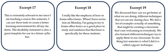 The last theme we noticed across a majority of GTA responses was how they appreciated when PD activities focused on Practicality and Actionable Takeaways. This theme involved comments about the desired Outcomes of the PD. What distinguishes this theme from the first theme regarding concrete examples connected to theory, is that GTAs are expressing the practicality of enacting and/or positive intentions to enact equitable teaching practices for themselves as GTAs, as opposed to appreciating teaching practices or ideas related to equity in the abstract, but not necessarily explicitly indicating an interest in applying ideas to their own classrooms, now or in the future. In other words, the comments captured with this code were about what we hoped our GTAs would take away from the PD, rather than if they just found the content memorable. Oftentimes, GTAs shared positive feedback on activities that were relevant to their position as a GTA leading a recitation or their own course (Figure 9). In their responses to interview questions or surveys, GTAs frequently mentioned when the PD supported them in teaching their course, such as how to create a disability statement [Excerpt 17], framing office hours as student hours [Excerpt 18], and specific active learning techniques, such as the Jigsaw method [Excerpt 19]. These GTAs usually mentioned these activities in conjunction to being “extremely relevant,” since they were teaching “this semester” [Excerpt 17] or because it was something they could actually implement immediately. We noticed that many GTAs voiced their positive feedback of the PD, employing phrasing about activities, like “apply them to our classroom” [Excerpt 19], “something they could do right now”, or “I can try this out in my class tomorrow.” These GTAs appreciated the clear connection between pedagogical theories and explicit discussion of actionable moves they could take as educators in their roles, either immediately or in the near future.