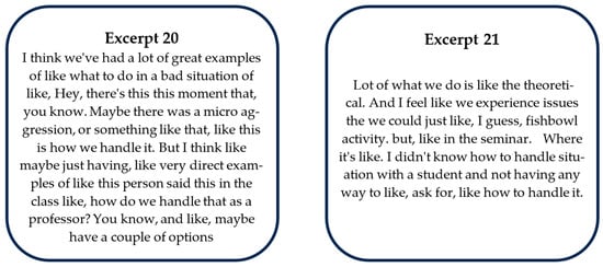 For example, Excerpts 4 and 5 indicated the lingering question of “how do I actually use” these equitable and inclusive ideas in the classroom. Similarly, GTAs mentioned when activities lacked explicit discussion about “how do we handle that as a professor” or “how to handle a situation” (Figure 10). We note even when there were “great examples” connected to pedagogical theory, the GTAs still wanted more “direct examples” and to talk about “a couple of options” to address those situations [Excerpt 20]. We noticed that in activities in which there were fewer direct conversations about applications to the classroom, there were more comments indicating that “what we do is like the theoretical” [Excerpt 21]. We take this to mean, not that theory is not useful or interesting to the GTAs, but rather that GTAs are primarily concerned with their current roles as teaching assistants versus their potential future roles as lecturers or professors. Overall, what we interpret from these comments is that PD activities should also provide tangible ways to shift GTAs’ teaching and interactions with students. In other words, the activities should not only meet GTAs where they are and provide immediately applicable teaching practices but also push them to try out those practices and grow in their teaching right now (Lee, 2005; Sims & Fletcher-Wood, 2021).
