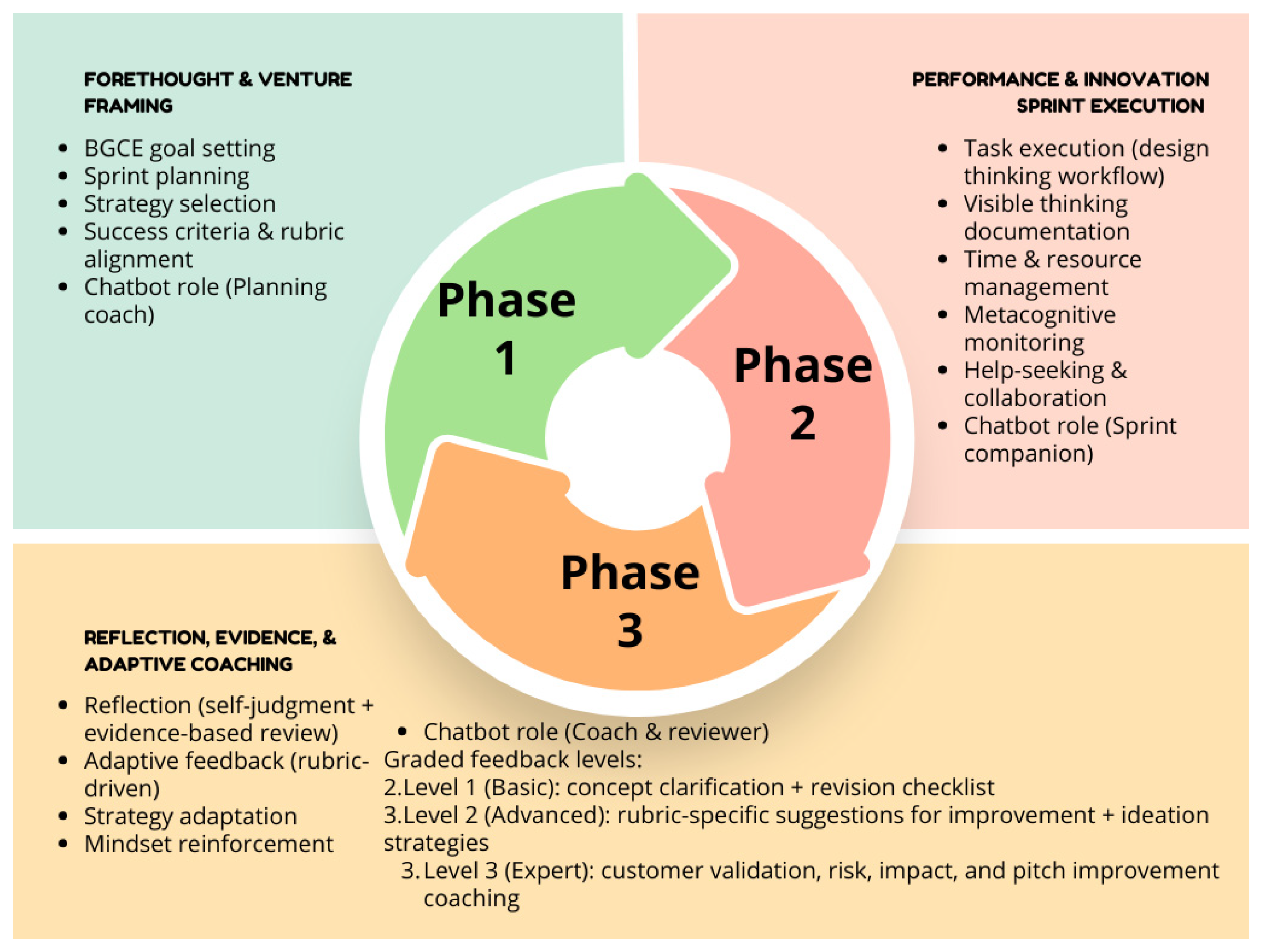 | Output chatbot | Prompt monitoring, checklist, sprint, feedback rubric 3-level |