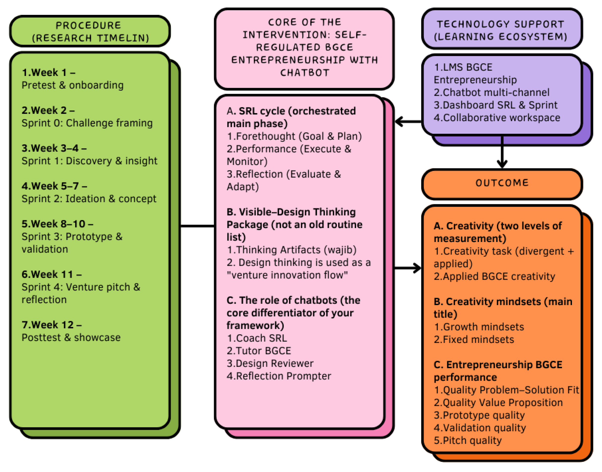 Chatbot for Self-Regulated BGCE Learning: Effects of Visible-Design Thinking Integration on Creativity and Growth Mindsets in Entrepreneurship