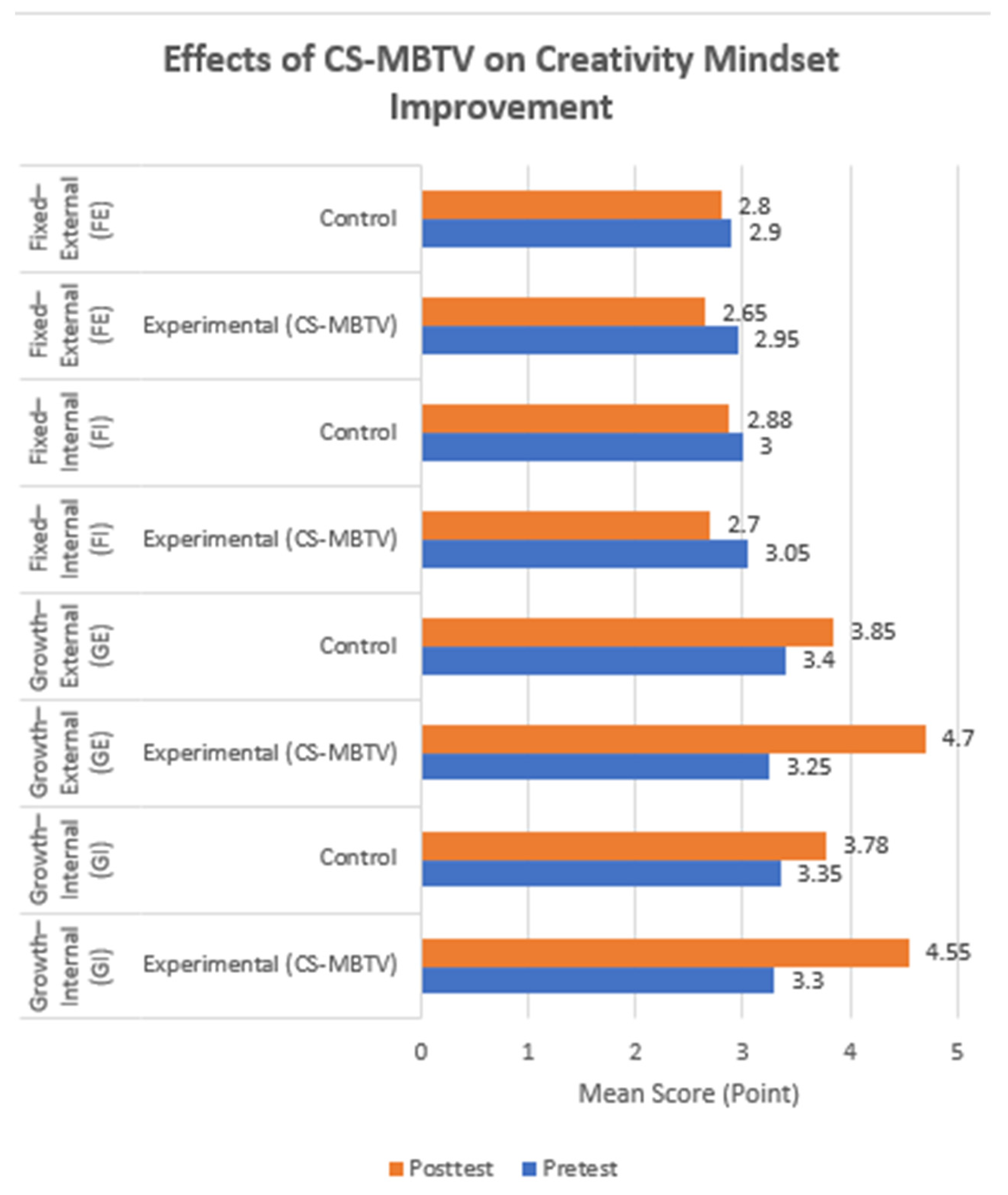 | Growth–External (GE) | Experimental (CS-MBTV) | 62 | 3.25 ± 0.80 | 4.70 ± 0.86 | 1.45 ± 0.76 |