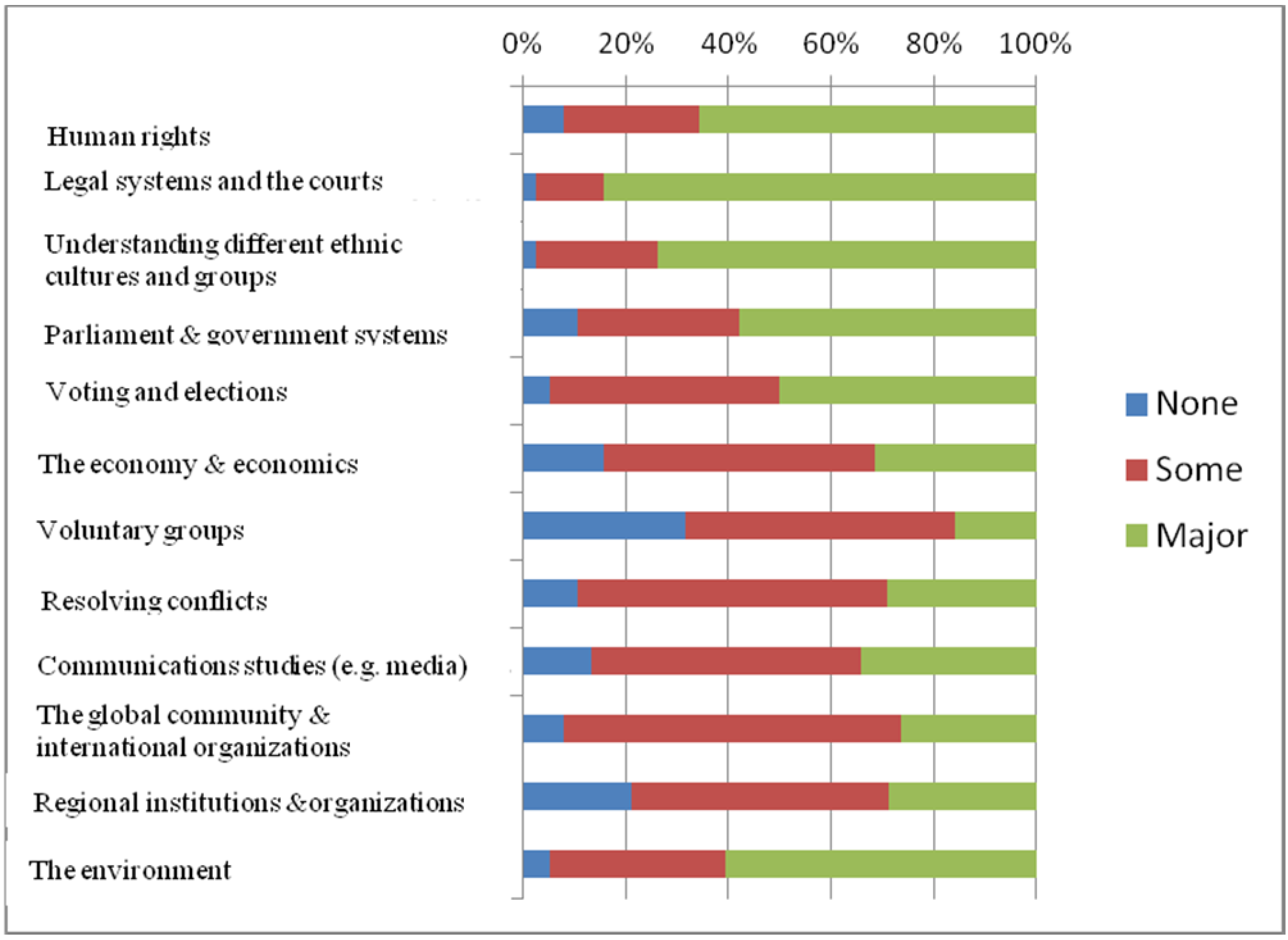 Perhaps more importantly, however, topics that might reflect a more international or global perspective—“The Global Community and International Organizations” and “Regional Institutions and Organizations”—are seen as major emphases in civic education for less than 30% of the participating countries. The same topics do not feature at all in 7.9% and 21% of countries respectively. Other topics such as “Human Rights” and the “Environment” may well have global dimensions, but the other topics where there is a major emphasis appear to be more related to local civic organizations or issues. Based on this analysis, therefore, it seems that local rather than global perspectives continue to dominate the civic education curriculum suggesting that the preparation of future citizens continues to be focused on national citizenship. This analysis supports the trend shown in Table 3 referring specifically to the case of Australia where the focus of the civic component of the national civic assessment was also on national and local political systems.
