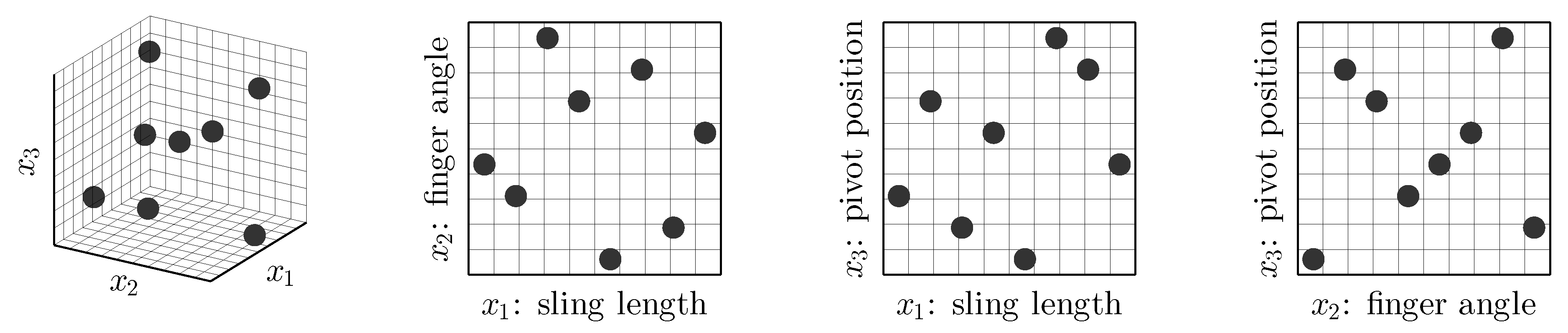 Early in the course, GE 100 students learn basic design of experiments (DOE) techniques (meeting 2). With this knowledge and some initial intuition stemming from hands-on exploration of the trebuchets, students are then asked to plan out a set of experiments. Each experiment is a distinct trebuchet design (i.e., combination of settings for reconfigurable variables) that the students would like to test physically. The number of physical tests is limited severely because the tests are conducted outdoors during class time, and adjustments must be made between tests. Over the course of several semesters, the trebuchet kits have been refined iteratively to streamline assembly and reduce adjustment time, but the time required to make adjustments still limits the total number of experiments that each project group can perform. During this initial set of experiments, the students have very limited design intuition for the trebuchets, so their experiments are often designed to sample the trebuchet design space broadly (i.e., students use a space-filling experiment design, see Figure 1). During this activity, a handout required students to perform the following activities in order: