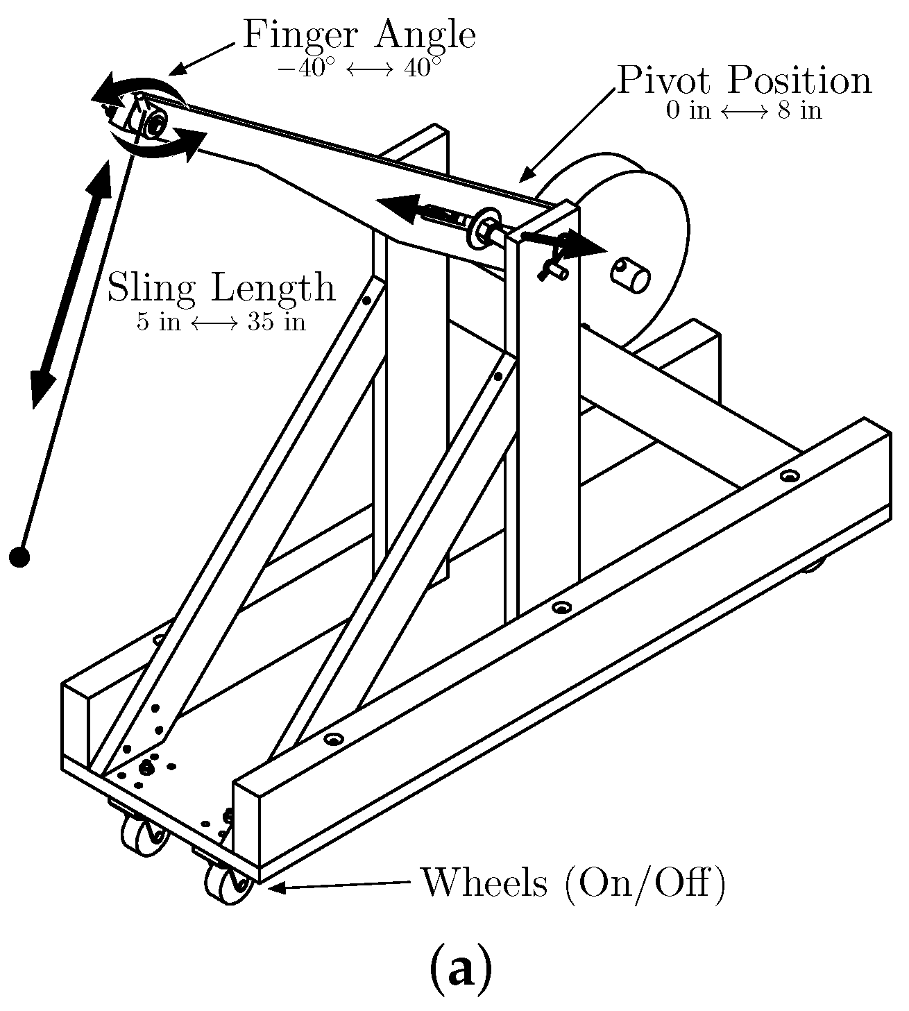In this section, we describe the design of customized trebuchet kits used by students in this redesigned GE 100 course. The primary motivation for designing these kits in-house was due to unavailability of commercial trebuchet kits that provided the adjustability needed to allow students to make design decisions. A new reconfigurable trebuchet kit was designed that allows continuous adjustments to pivot position, sling length, and finger angle (see Figure 2a). The kits also support one discrete design decision: whether or not wheels are used on the trebuchet base. The kits were designed for durability, ease of use by students (streamlined assembly and adjustments), and ease of fabrication (no specialized equipment required). Engineering drawings, course materials, and software models have been made freely available so that other institutions may use this project as a teaching aid. We now look briefly at some of the design aspects of these trebuchet kits. A number of factors shaped the final design of the trebuchet: