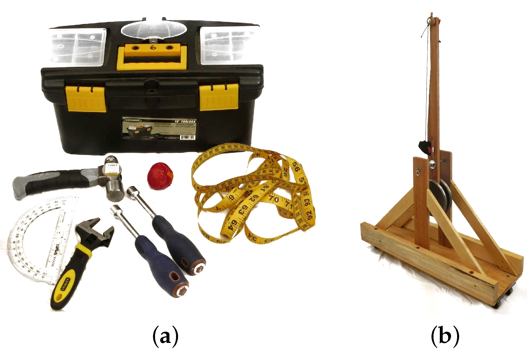 Photographs of a student toolkit and a trebuchet. (a) toolbox and select tools for assembly and design variable readjustments; (b) assembled trebuchet.
