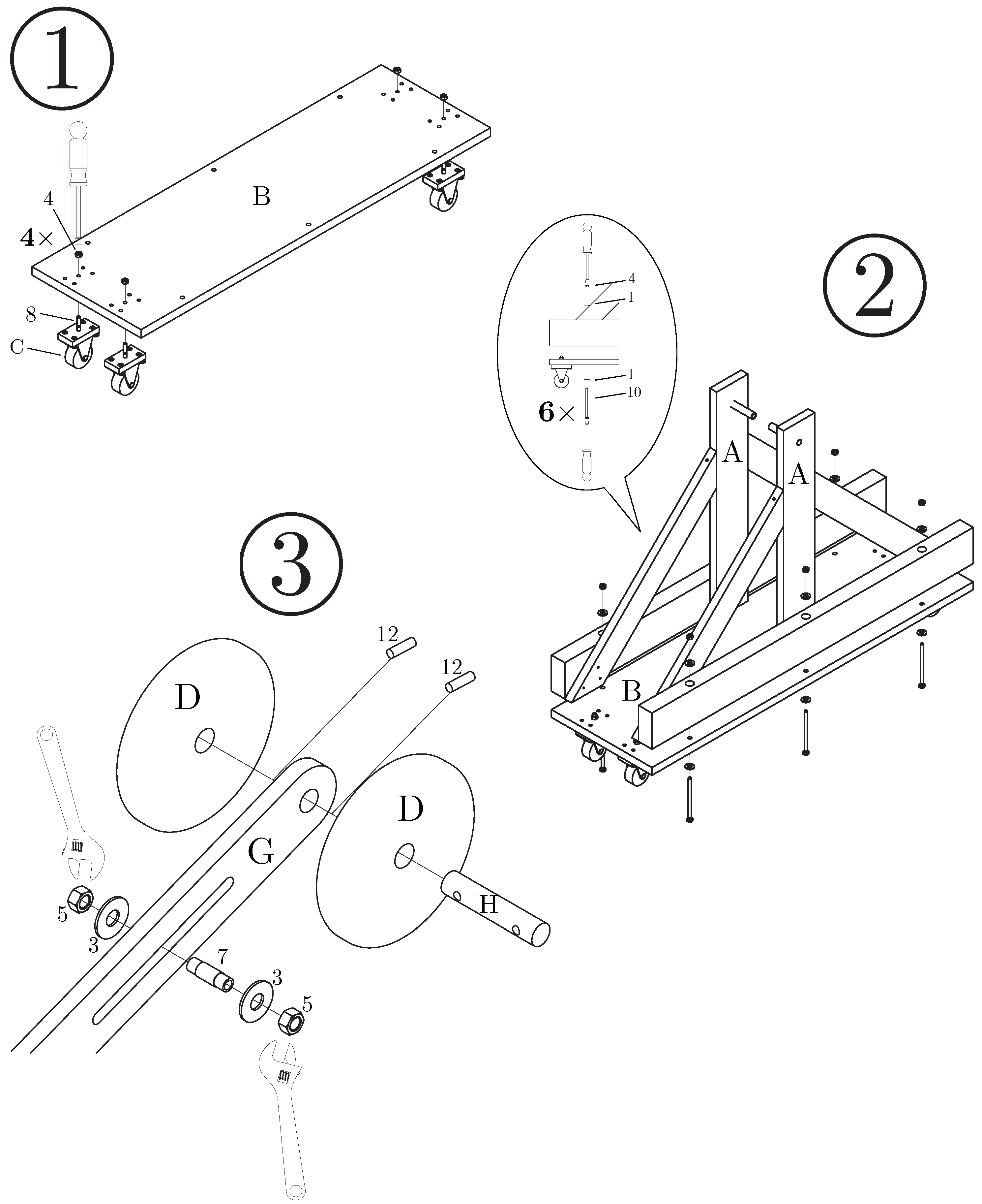Drawings illustrating steps 1–3 in the assembly instructions. Step (1) involves fastening of casters to the trebuchet base. Step (2) illustrates attachment of upright shoulders to the base. Step (3) involves assembly of the pivot mechanism and attachment of the counterweights.