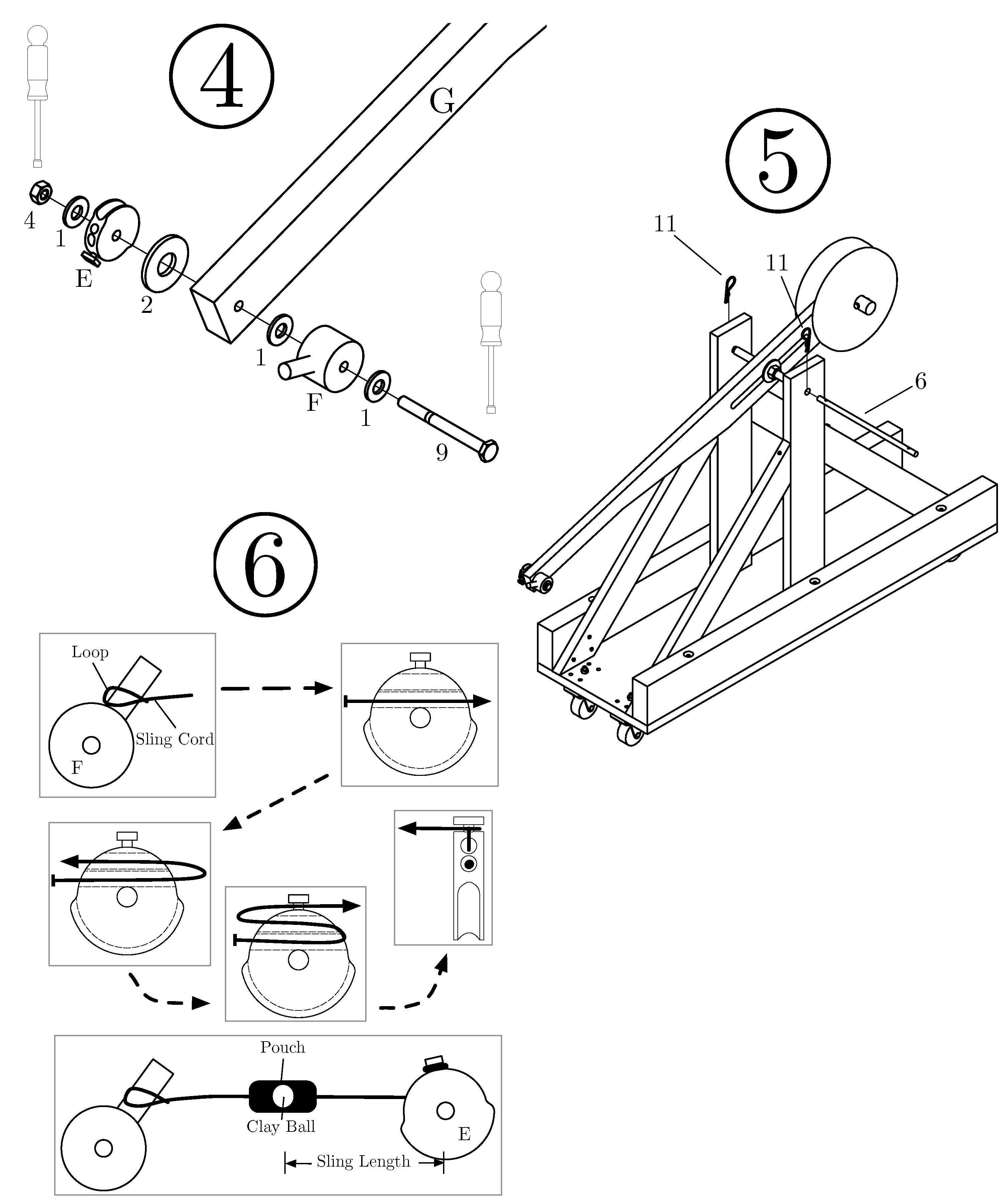 Drawings illustrating steps 3–6 in the assembly instructions. Step (4) illustrates how the finger assembly is to be installed. The throwing arm assembly is then attached to the trebuchet body via the fulcrum in Step (5). Step (6) shows how to attach the sling. The end of the sling cord with a loop is first slid over the finger (part F), and then the other end of the sling is threaded through the clamp mechanism (part E). This clamp mechanism allows rapid adjustment of sling length without the need to untie or tie knots, and also prevents sling cord damage.