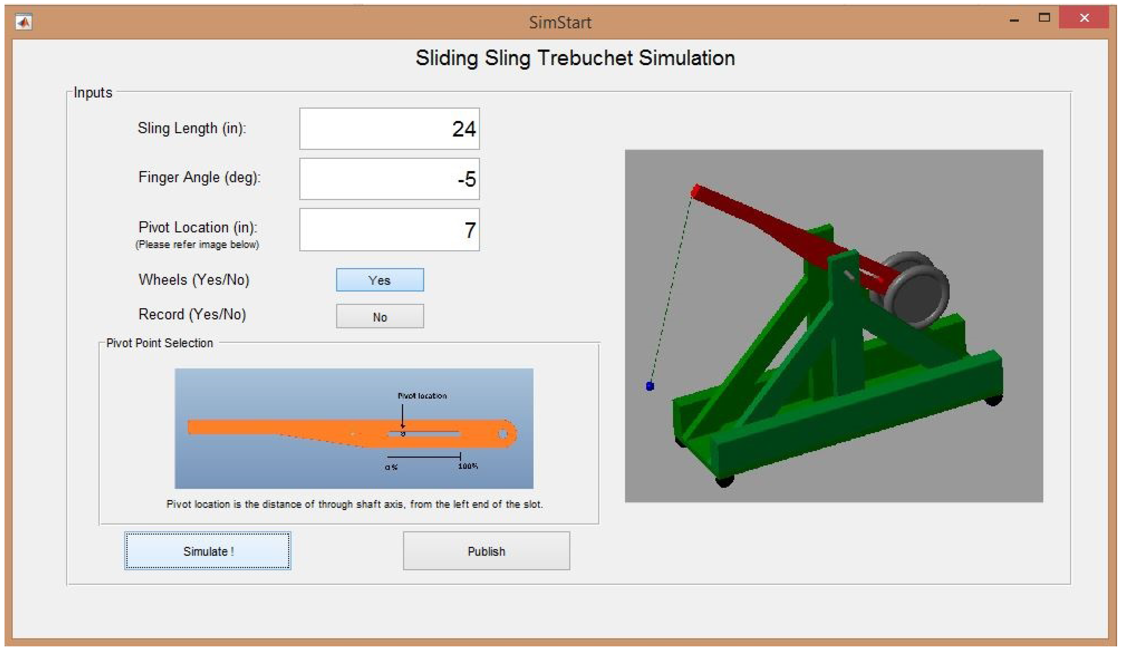 The physics-based simulation model for trebuchet was developed in MATLAB® and SimMechanicsTM software. The software interface for this simulation model is shown in Figure 7. The goal of providing students with a computer simulation model is to help them experience directly the importance of model-based design in the overall design process. It helps them to develop more accurate intuition through rapid creative exploration of the design space, and demonstrates through experience the value of rapid simulations when striving to solve a design problem quickly [31], and to identify better designs than can be achieved through slower physical testing.