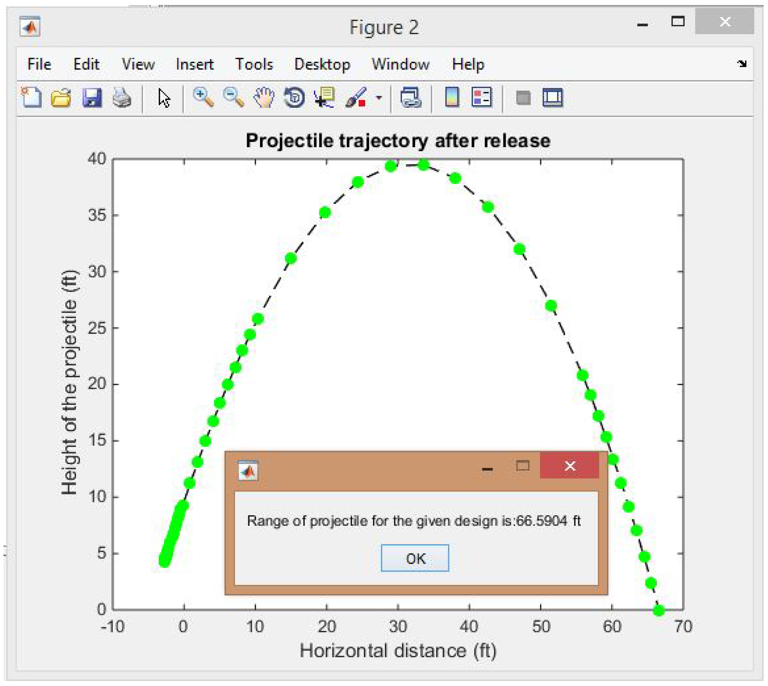 The simulation model is used by students to explore the design space and to discover the relative importance of design variables on improving range. This intuition helps students identify designs quickly that maximize range according to simulated results. The produces two important outputs: (1) predicted throwing range for a given design and the predicted path of projectile as shown in Figure 8; and (2) an animation of trebuchet motion during the sling launch as shown in Figure 7. This rich set of outputs is designed to help students gain insight into how the system behaves, and how design changes influence specific aspects of dynamic behavior.