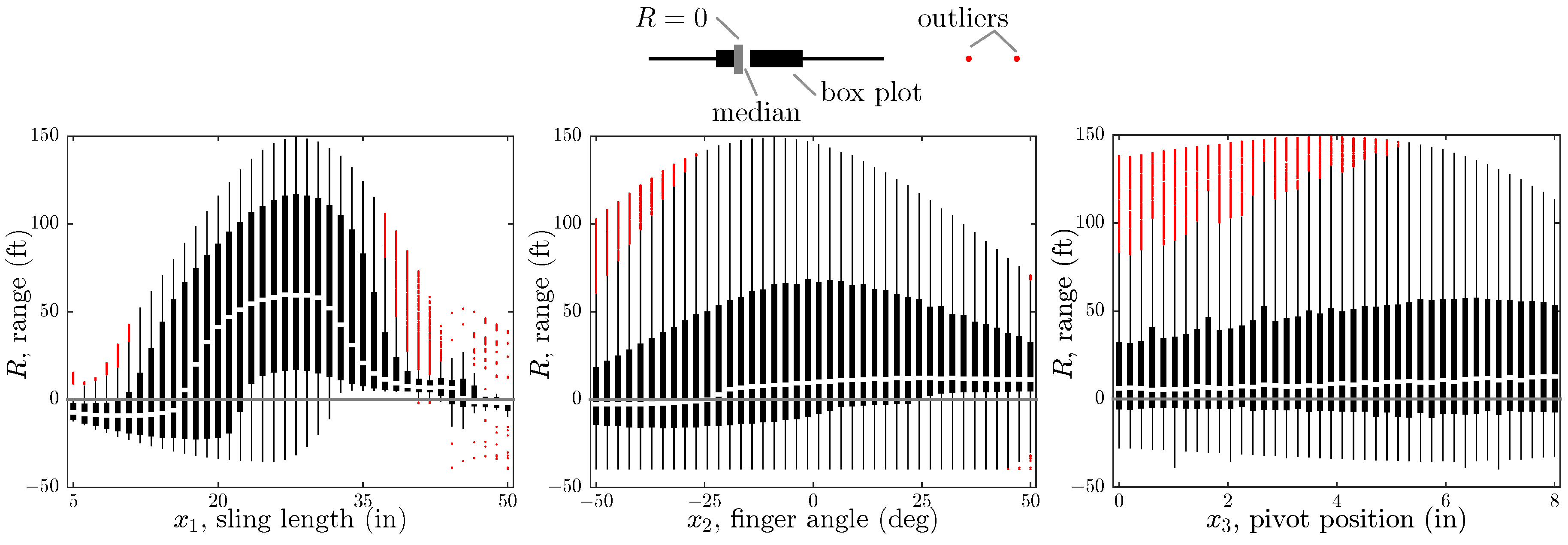 Appropriate ranges for continuous design variables (defined by upper and lower bounds) were identified using the multibody dynamic model. Each of the continuous design variables was varied over a large range of values. This study is shown in Figure 9; individual box plots show the distribution of the range varying the other two continuous design variables. The median range is the central white line, quartile 1 to quartile 2 is shown with a black box, and the range excluding outliers has a thinner black line. Outliers are marked with small red dots. From these studies, we see that the sling length is the most influential of the design variables since the distribution of range is most strongly correlated with the sling length (i.e., large median when ). However, we note that the model seems to break down at around 40 inches for the sling length. Similar conclusions can be drawn for the other two variables. This study was used to identify appropriate values for variable bounds provided to the students in Table 2.