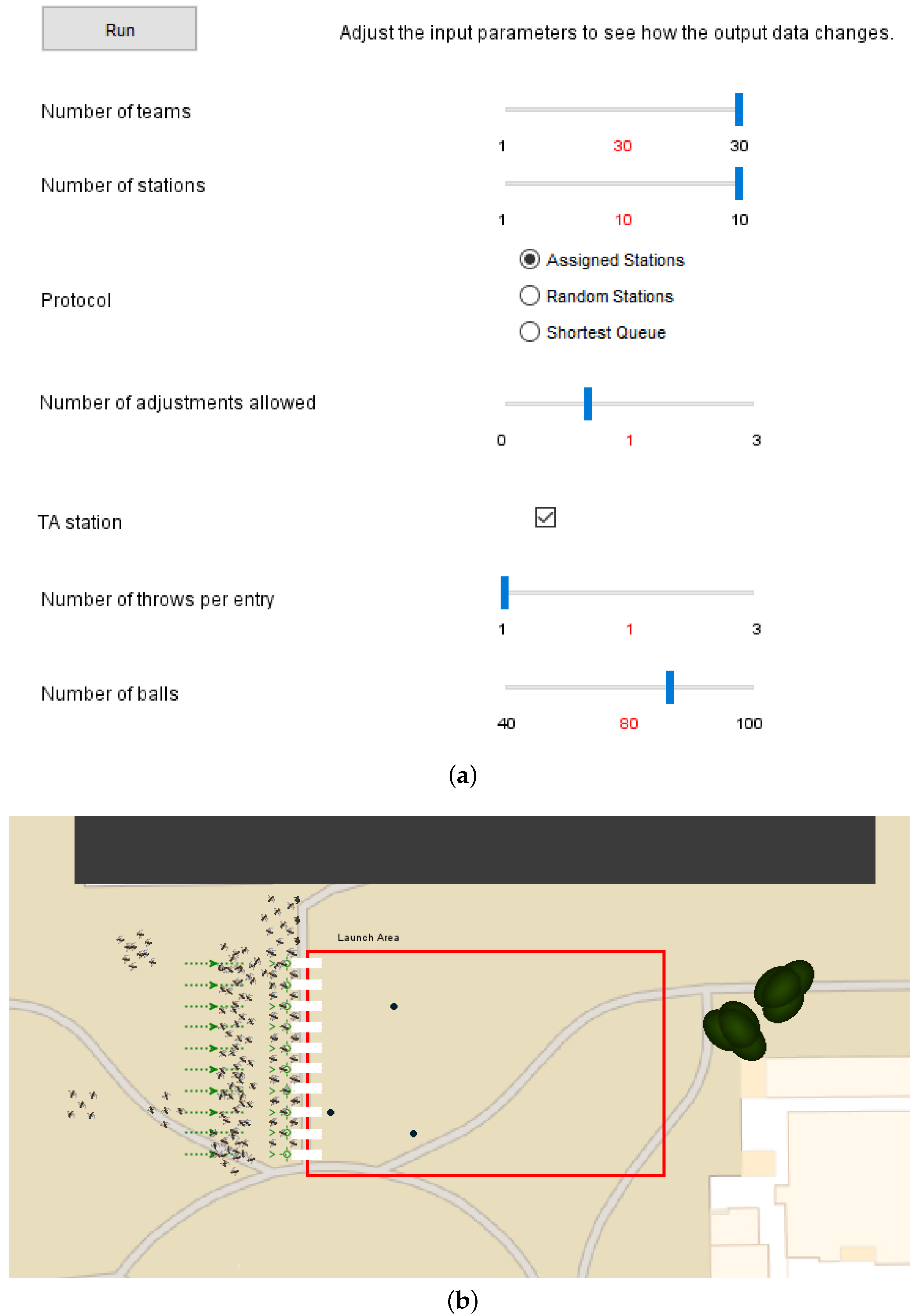 A logistics model was developed that combines agent-based modeling [29] and discrete-event modeling [30] in AnyLogic® to model the students behavior during the field day activities. This model is introduced to the students before the physics-based SimMechanicsTM model so that the students can get familiar with the field day logistics through the animation demonstrated in Figure 11b, while learning important modeling principles and considerations, such as assumptions, constraints, required data, performance criterion, and protocols.